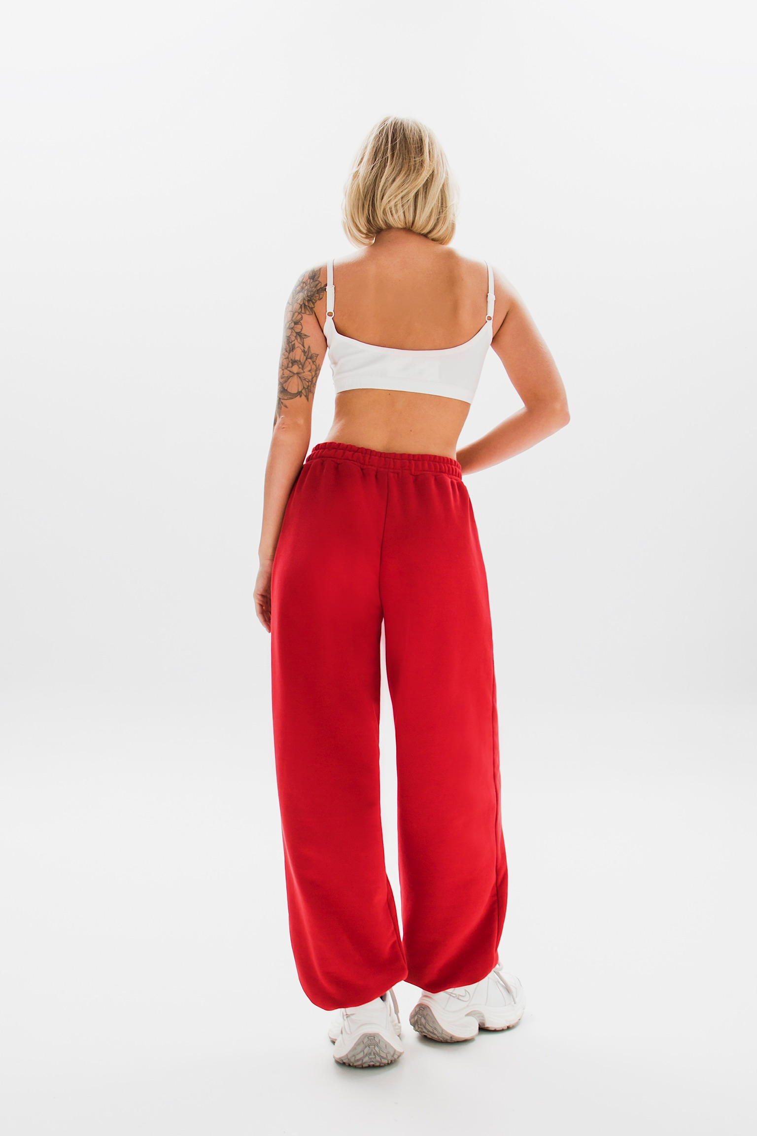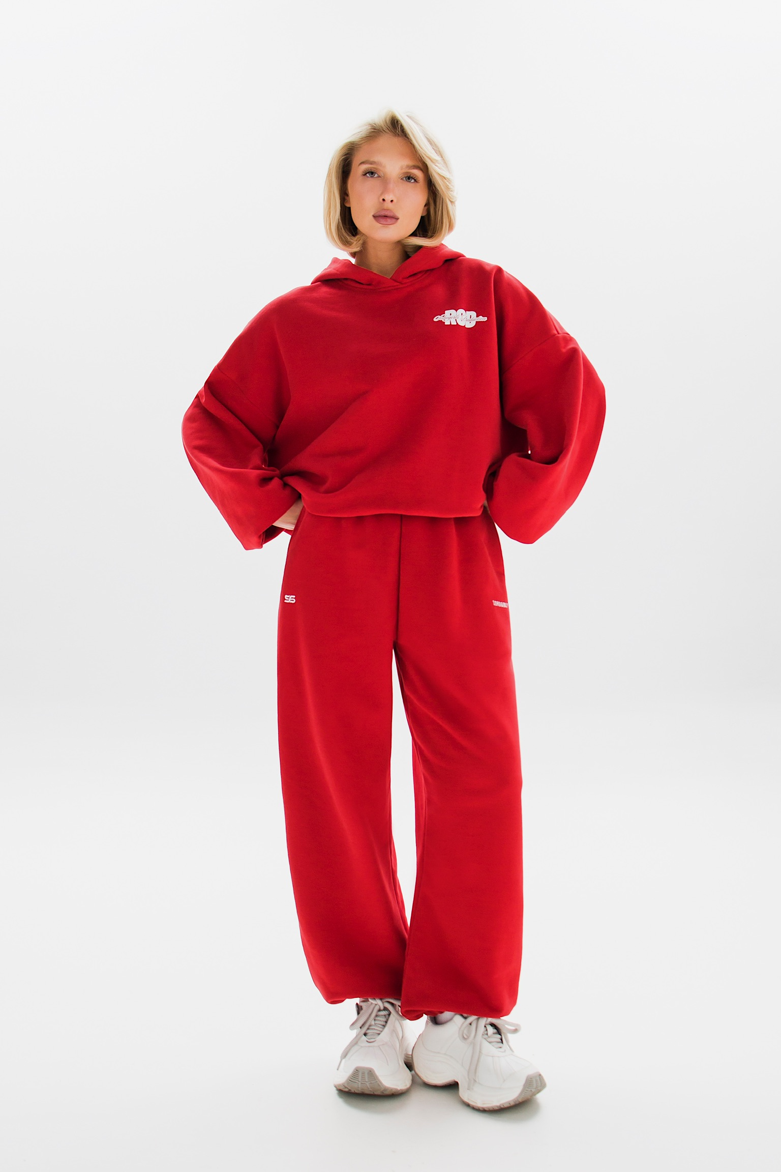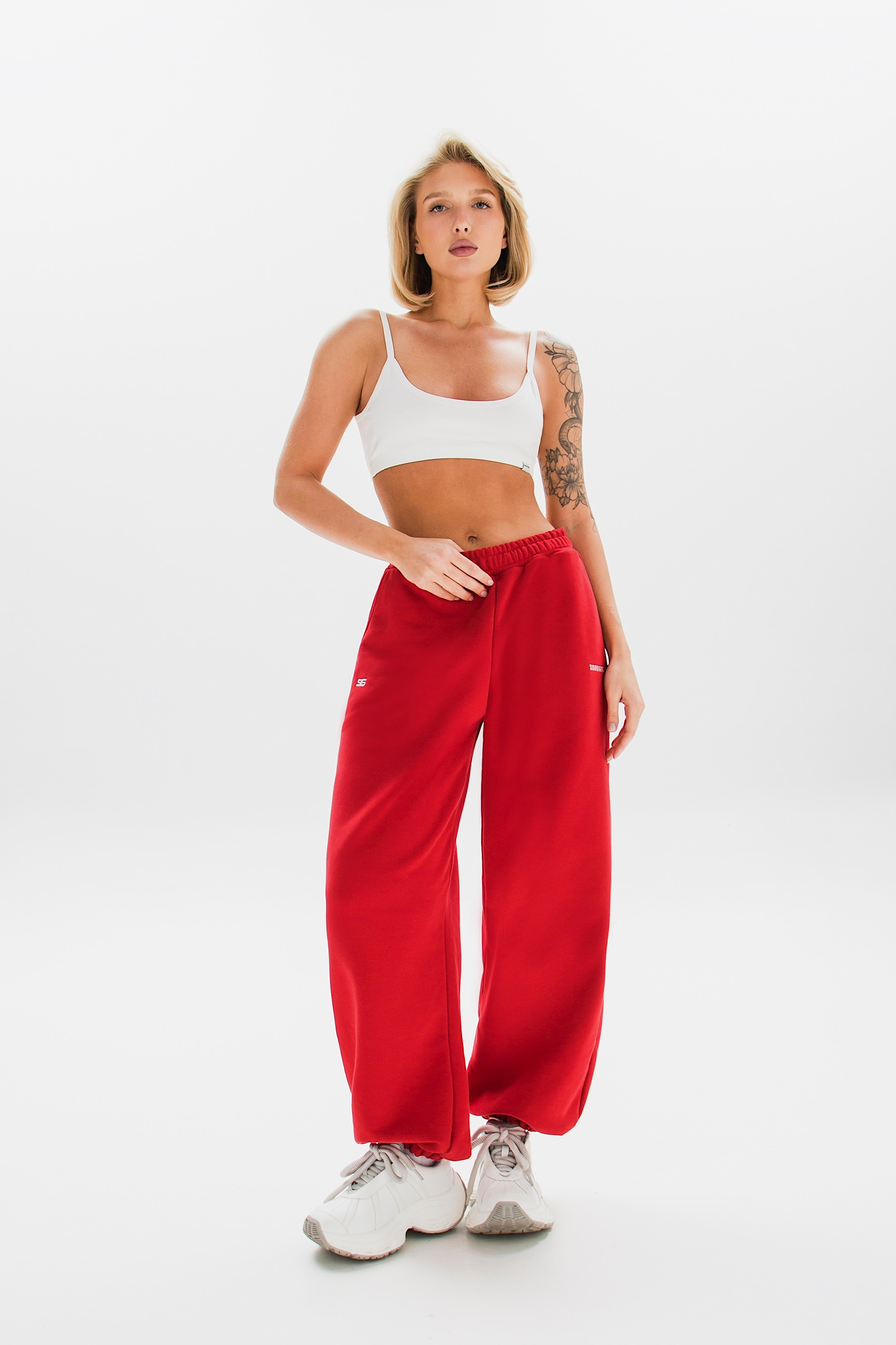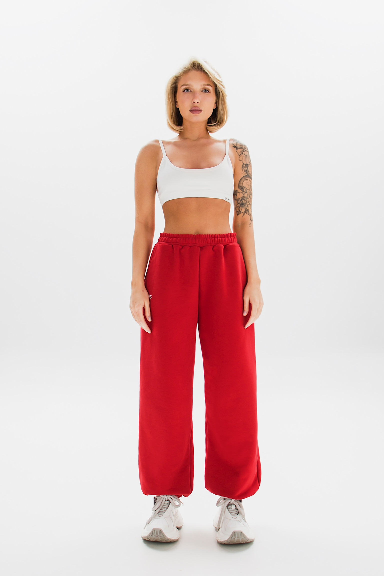 Модель с завышенной талией, свободным кроем и широкой резинкой идеально подчеркивает фигуру. Декоративные вышивки у карманов добавляют акцент.
