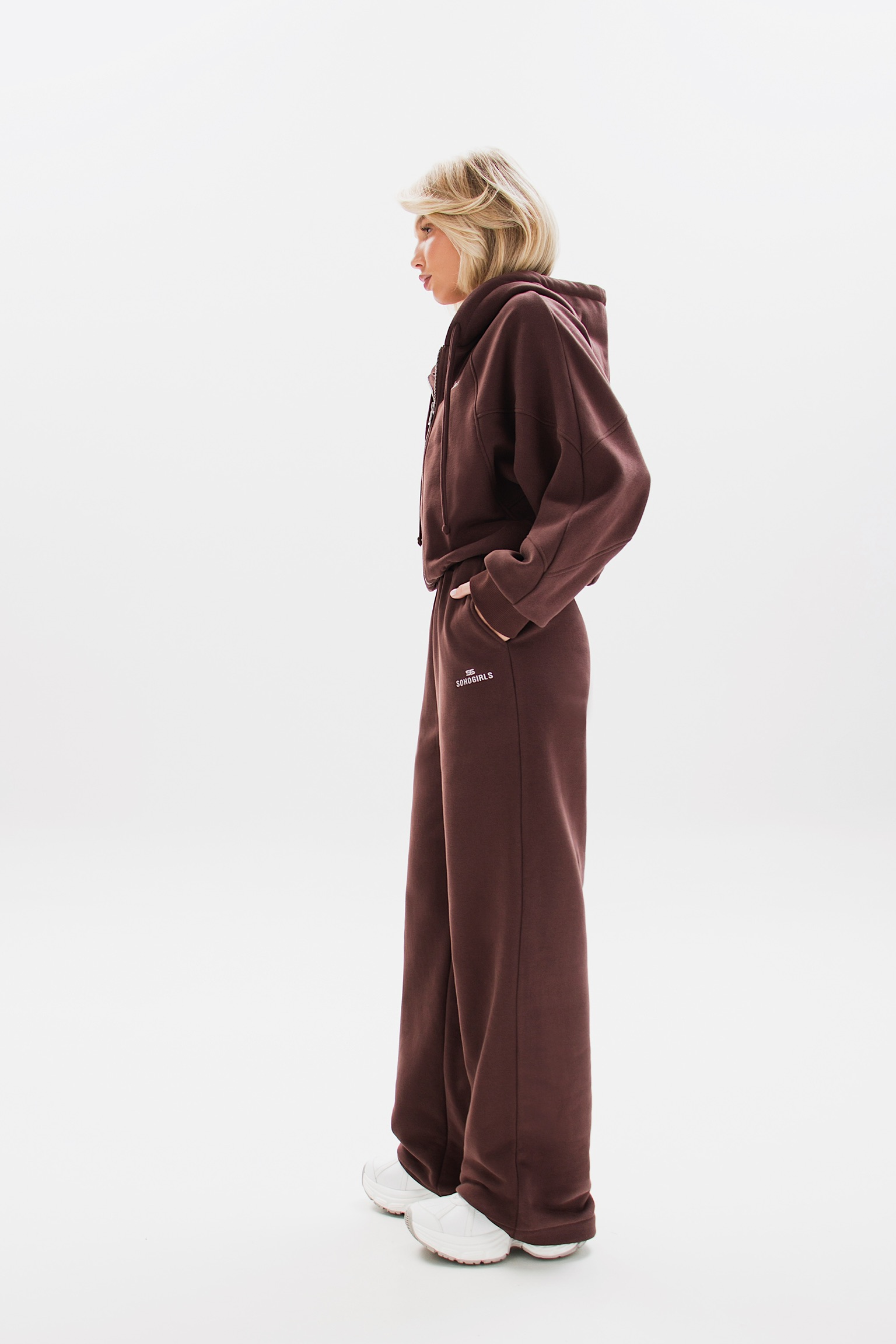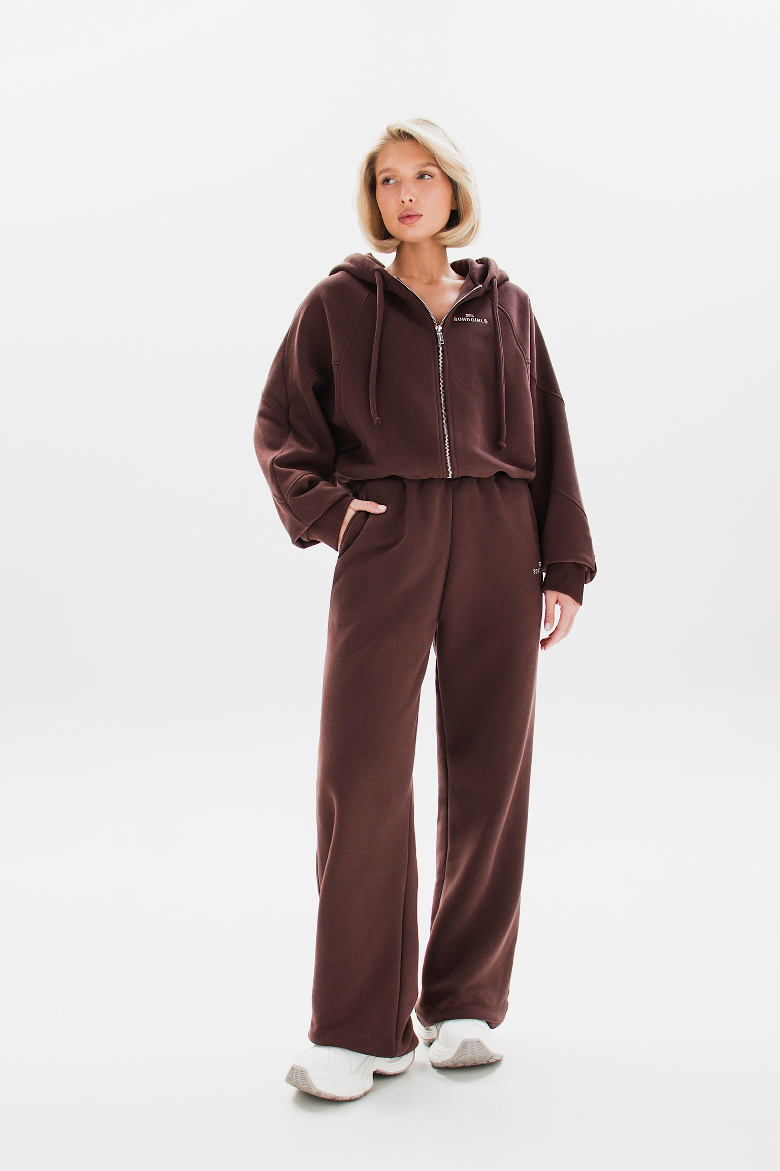 Брюки можно носить как классические палаццо или трансформировать в стильные джоггеры, используя скрытые фиксаторы снизу. Такой функциональный дизайн подойдет для создания различных образов