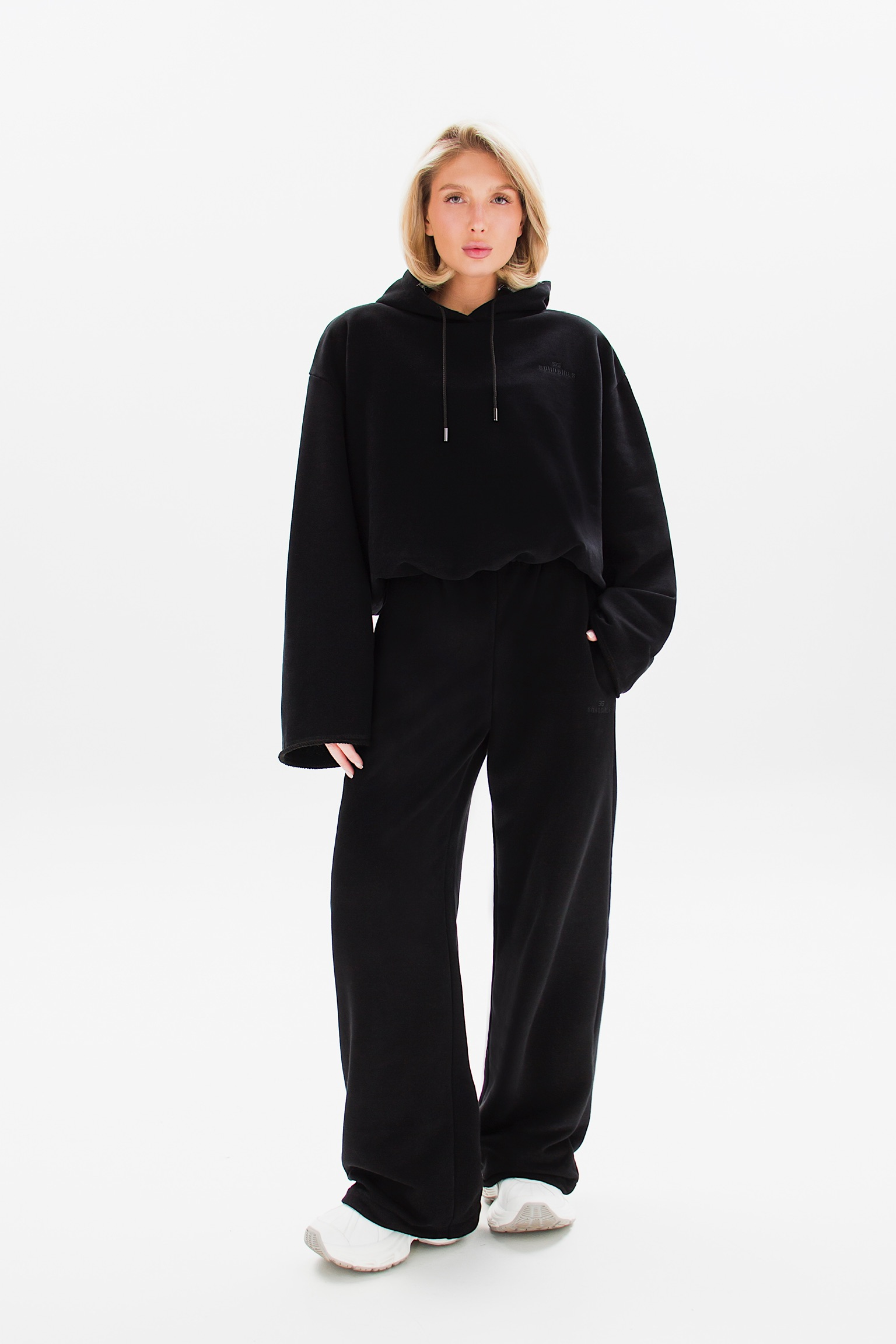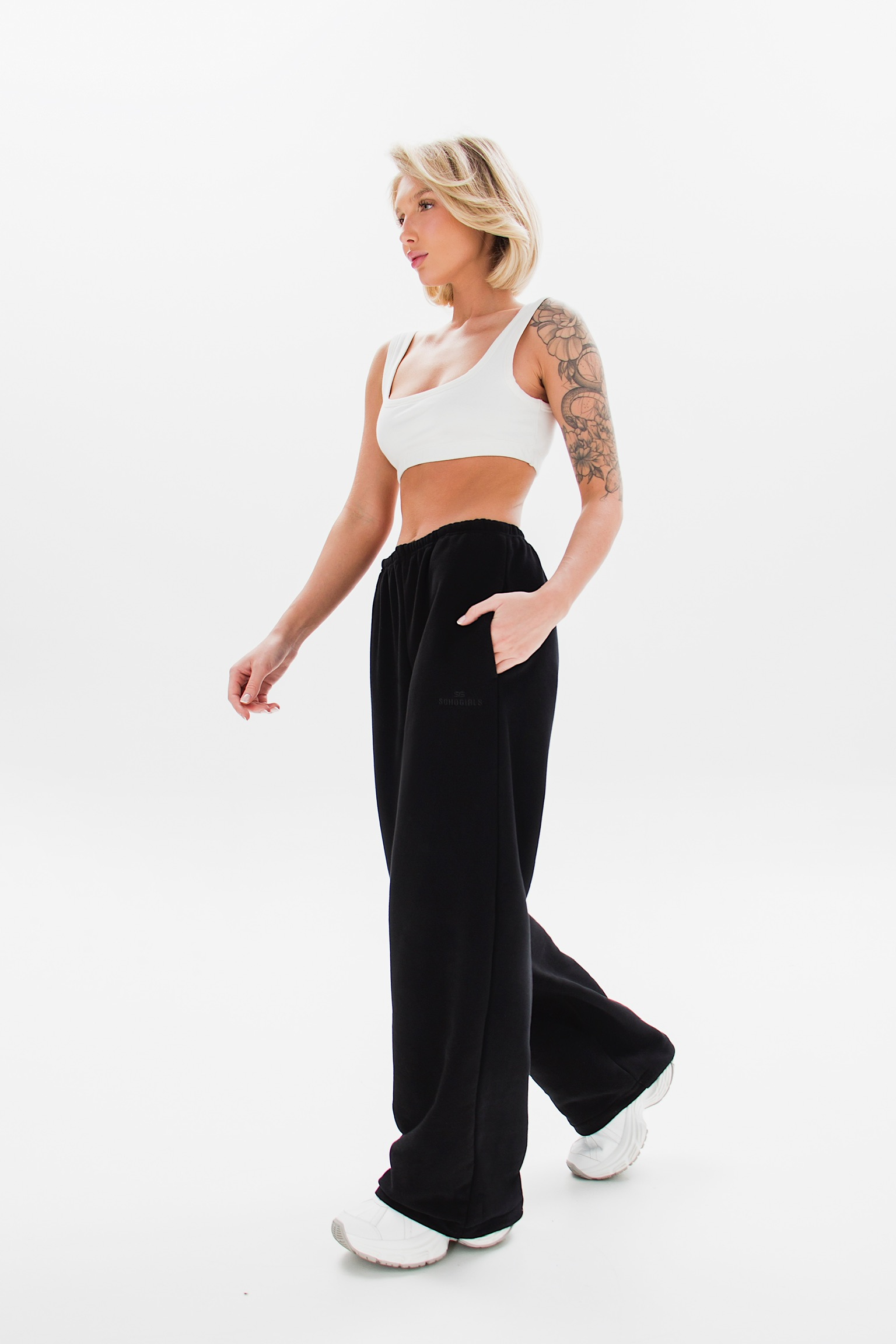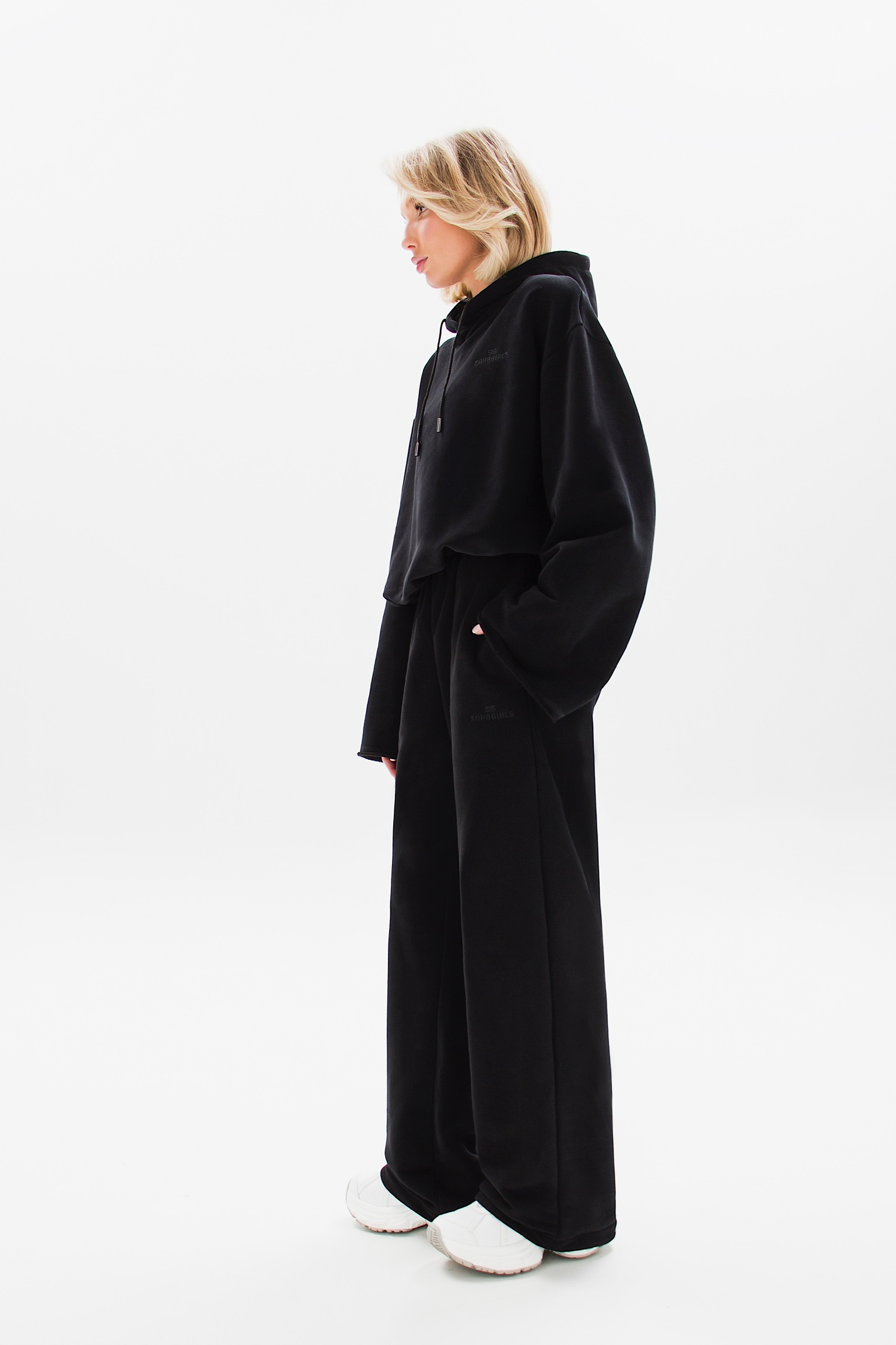 Брюки можно носить как классические палаццо или трансформировать в стильные джоггеры, используя скрытые фиксаторы снизу. Такой функциональный дизайн подойдет для создания различных образов