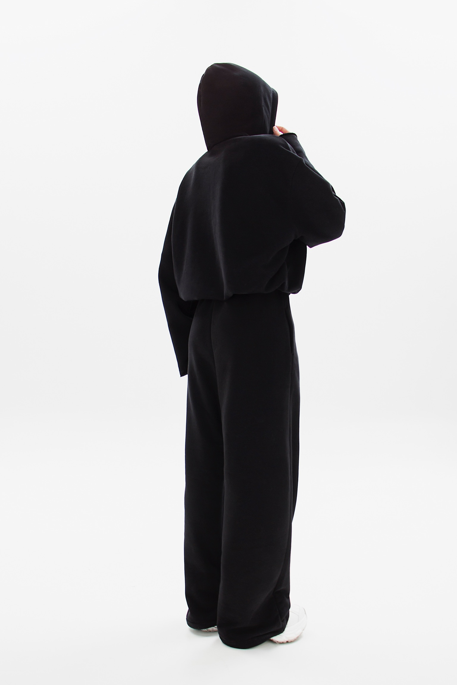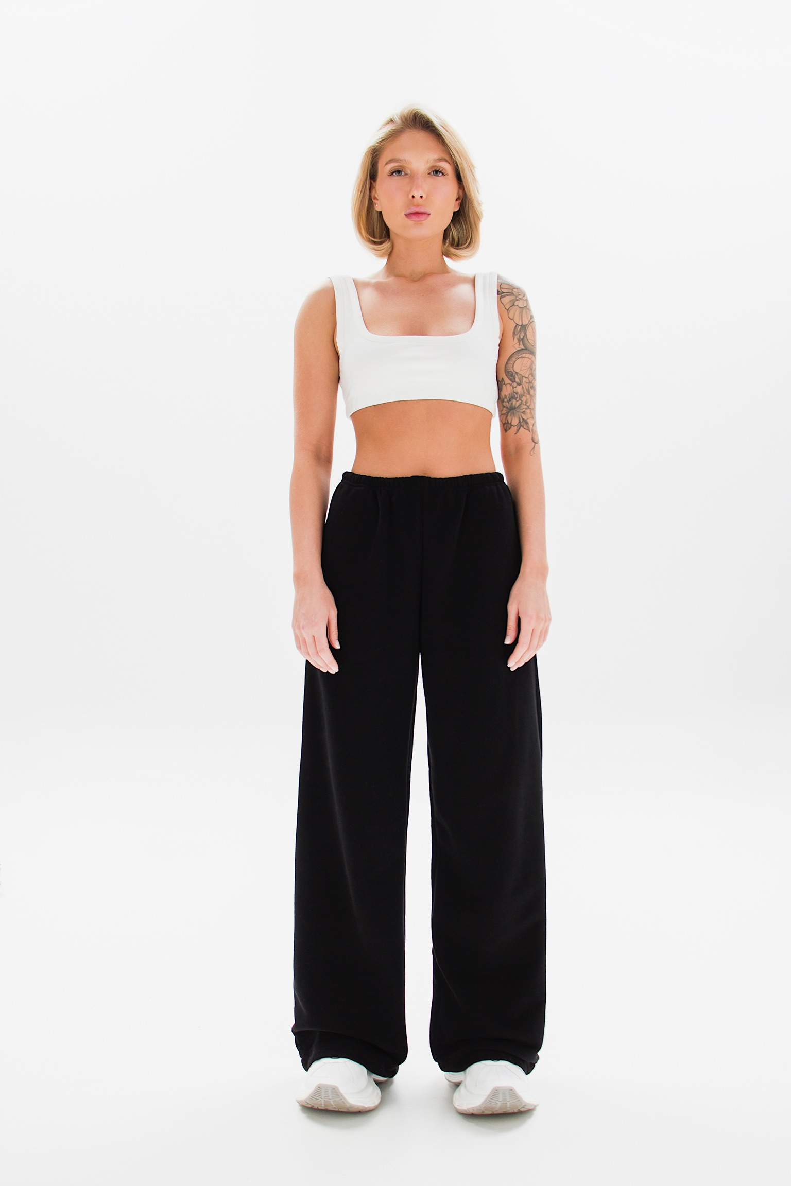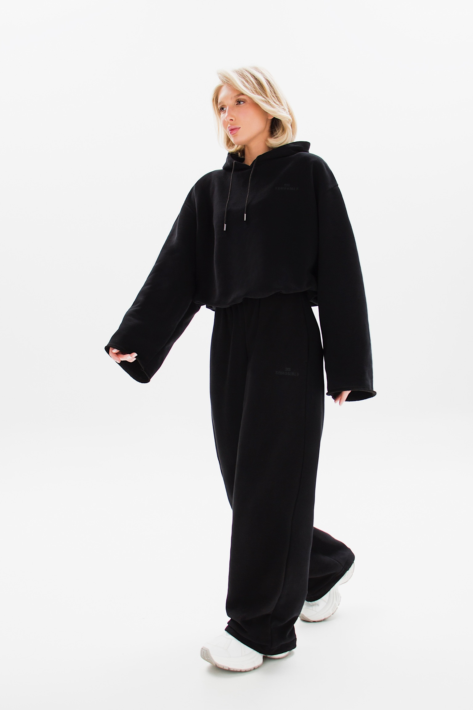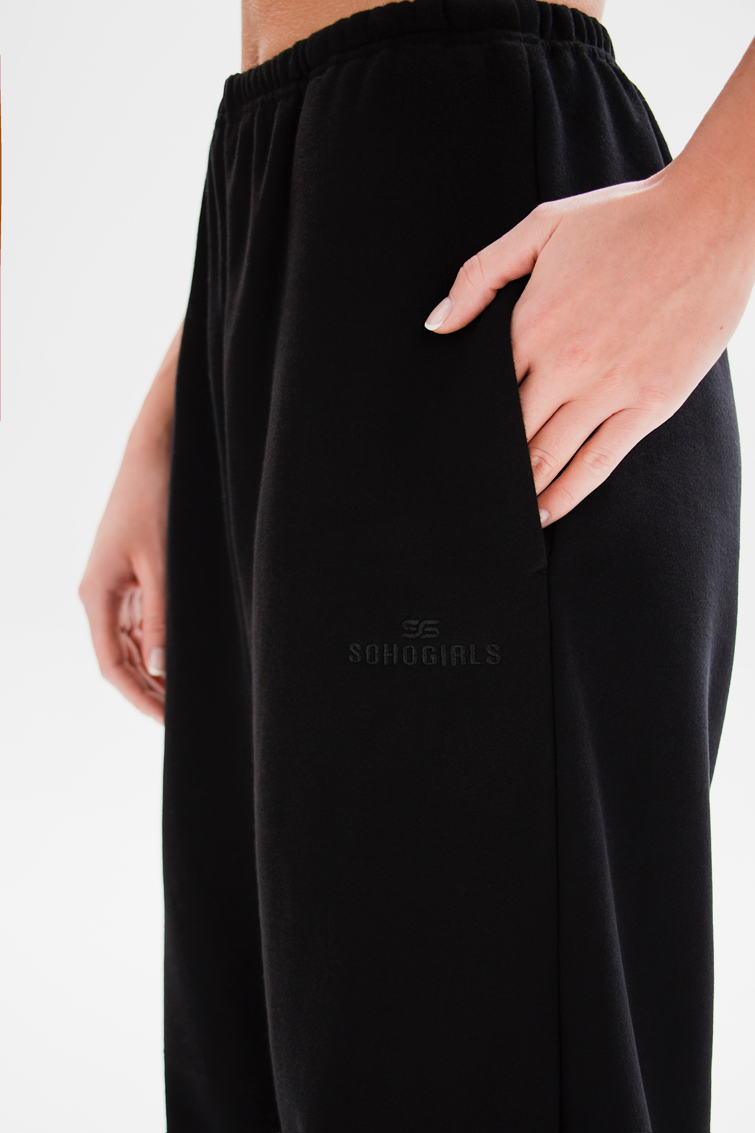 Брюки можно носить как классические палаццо или трансформировать в стильные джоггеры, используя скрытые фиксаторы снизу. Такой функциональный дизайн подойдет для создания различных образов