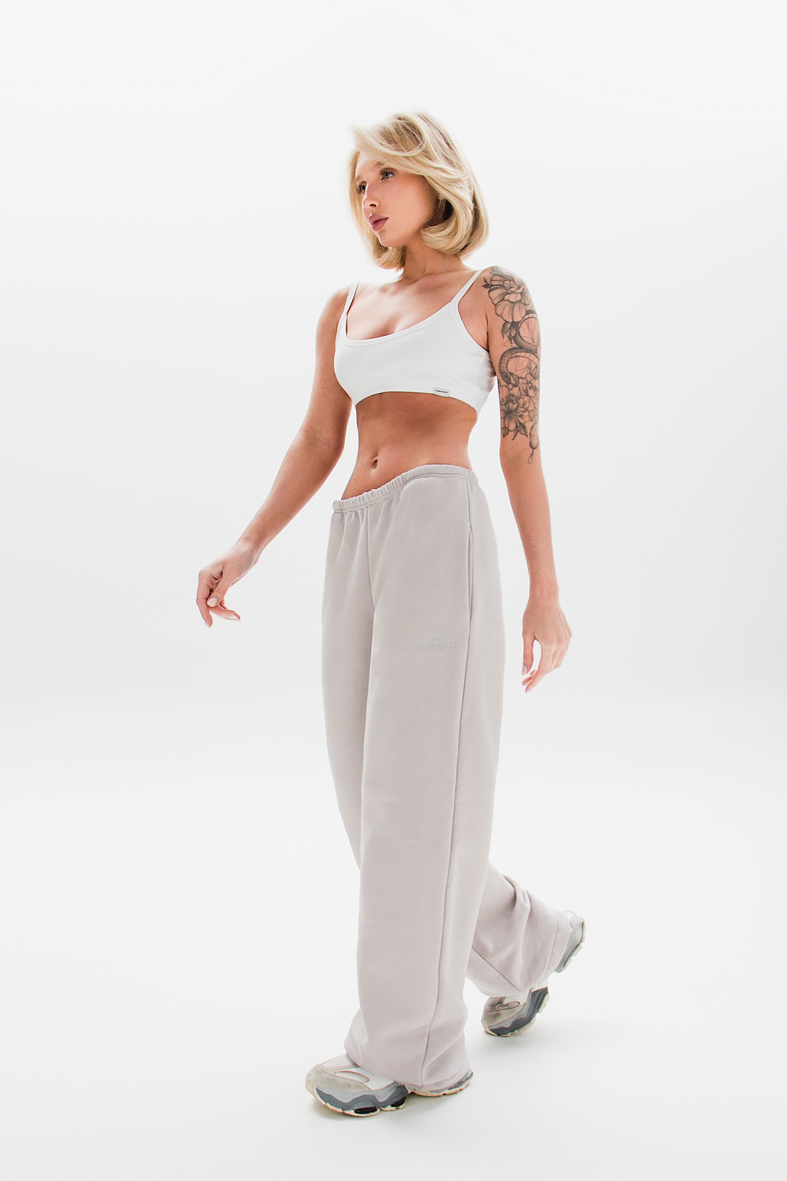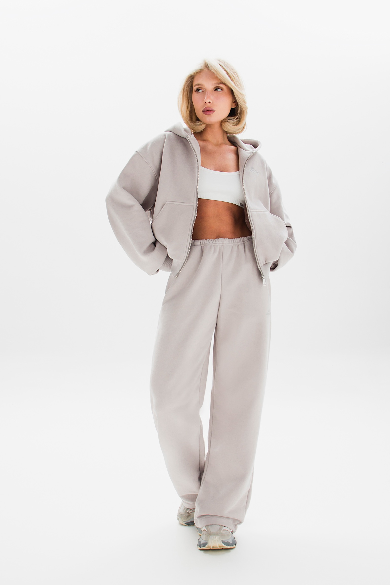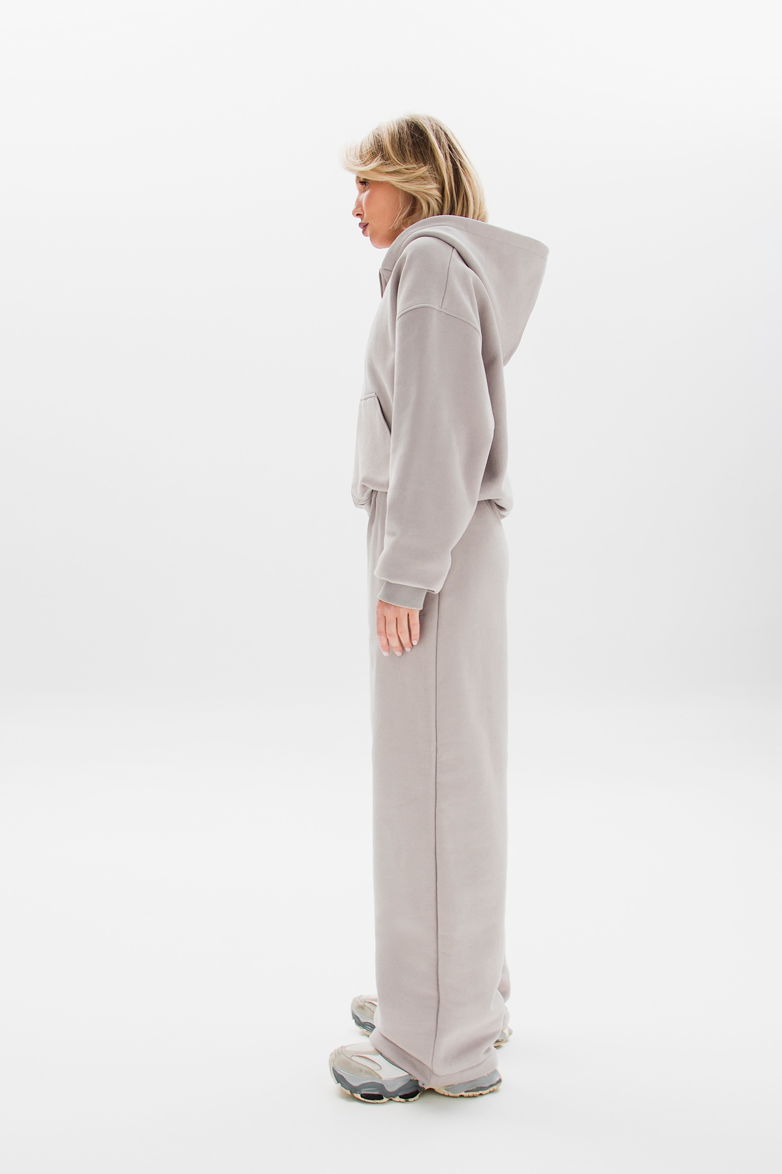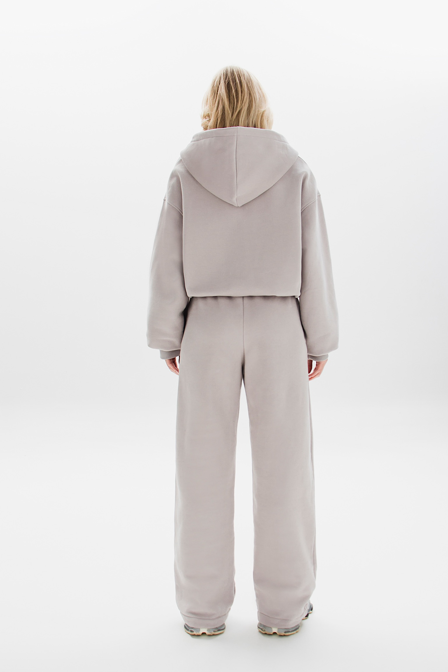 Брюки можно носить как классические палаццо или трансформировать в стильные джоггеры, используя скрытые фиксаторы снизу. Такой функциональный дизайн подойдет для создания различных образов