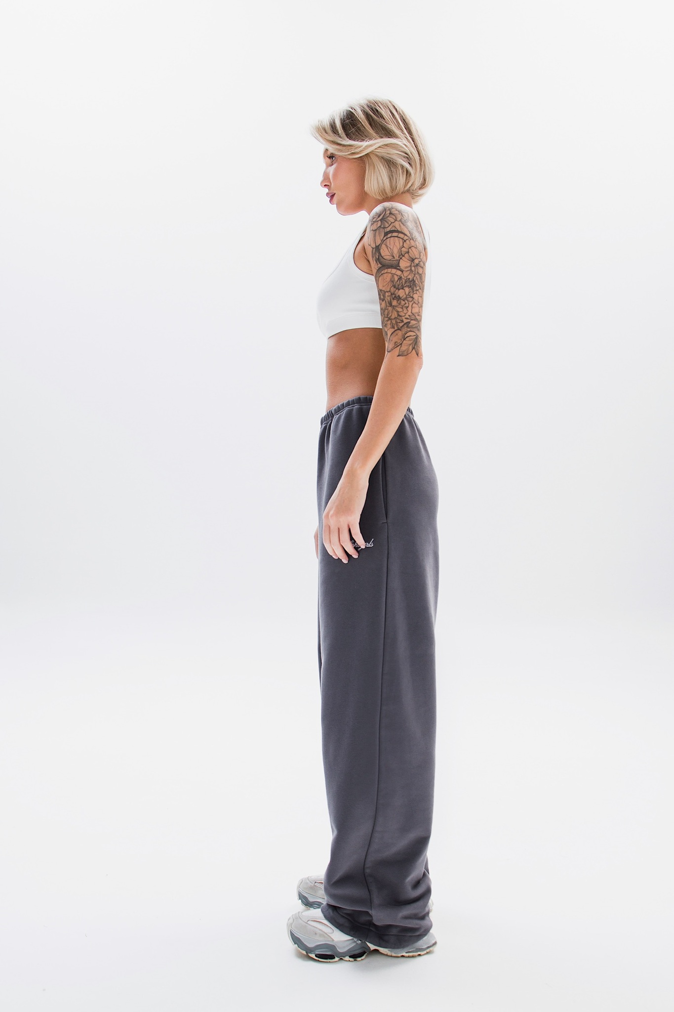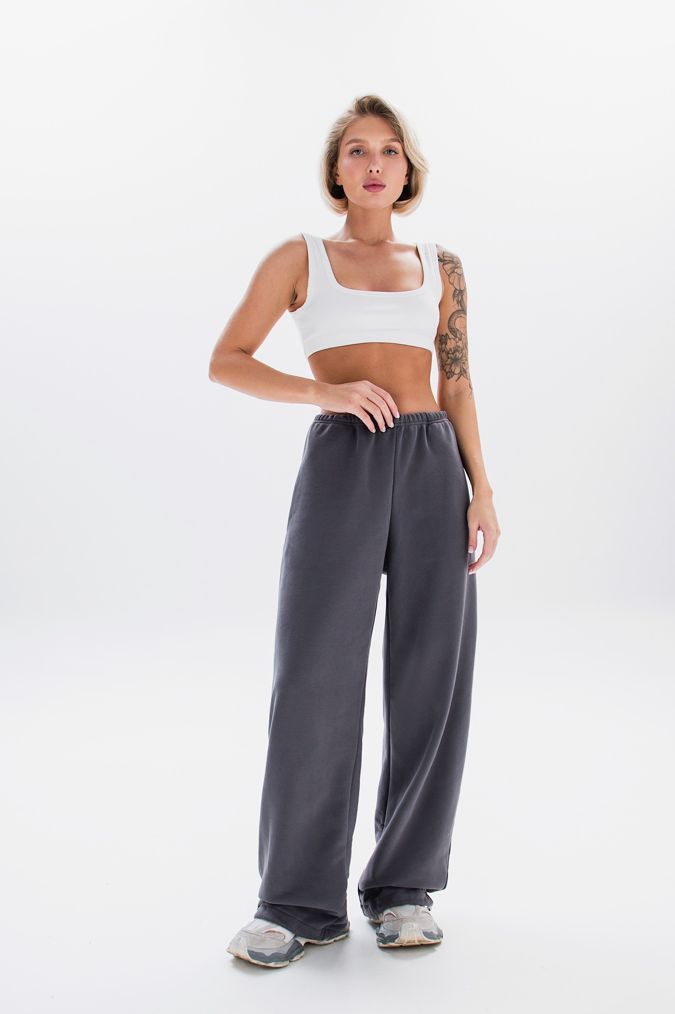 Брюки можно носить как классические палаццо или трансформировать в стильные джоггеры, используя скрытые фиксаторы снизу. Такой функциональный дизайн подойдет для создания различных образов