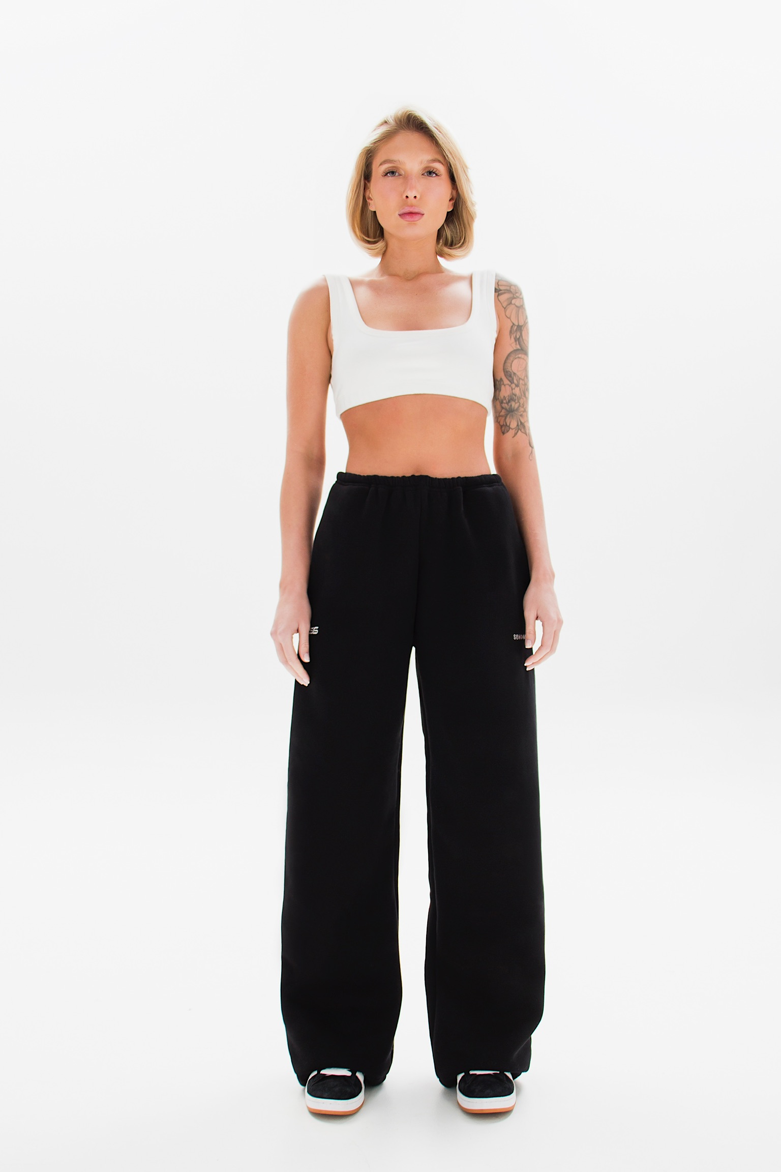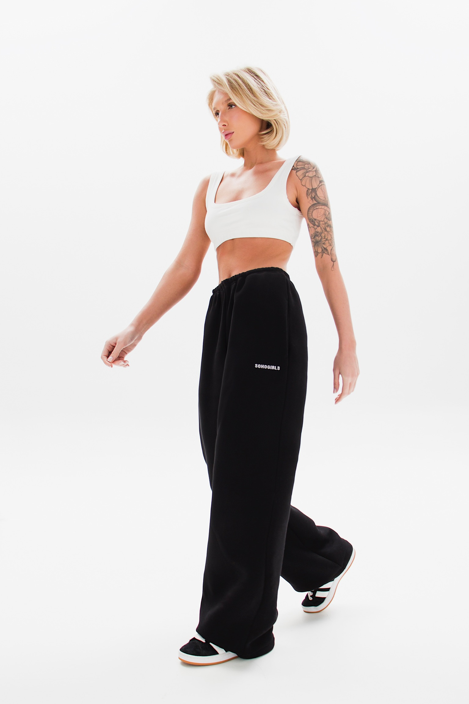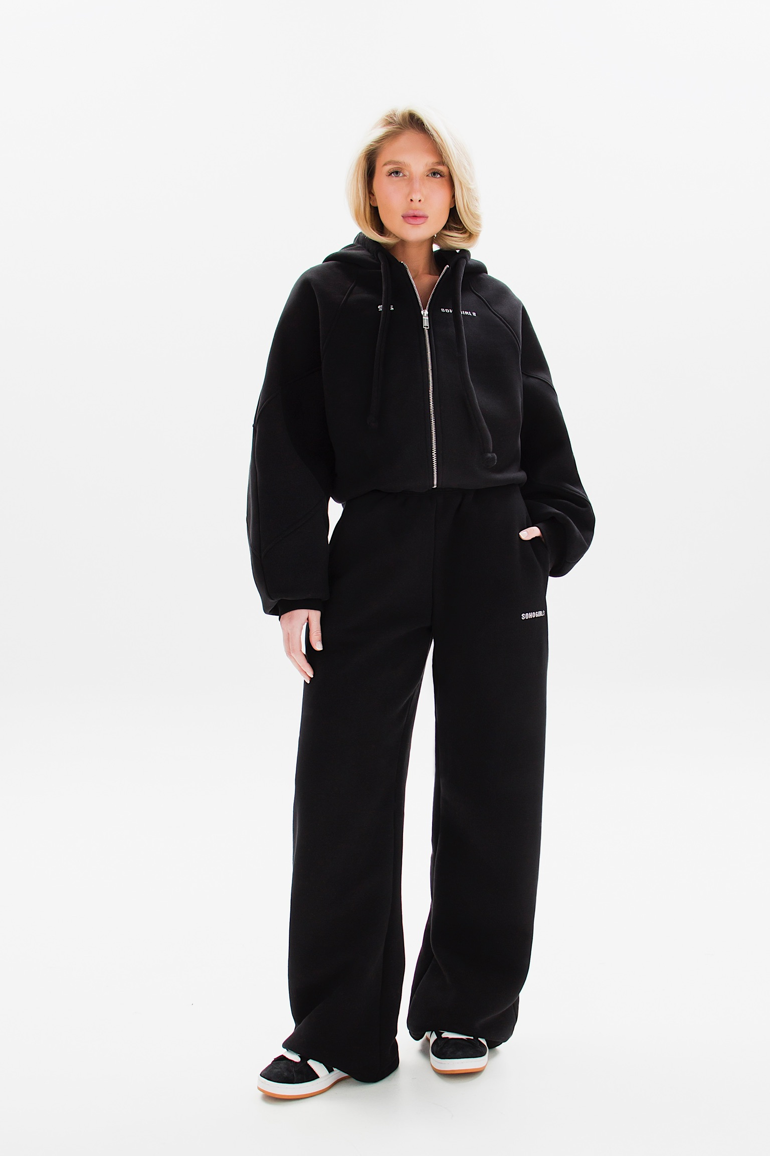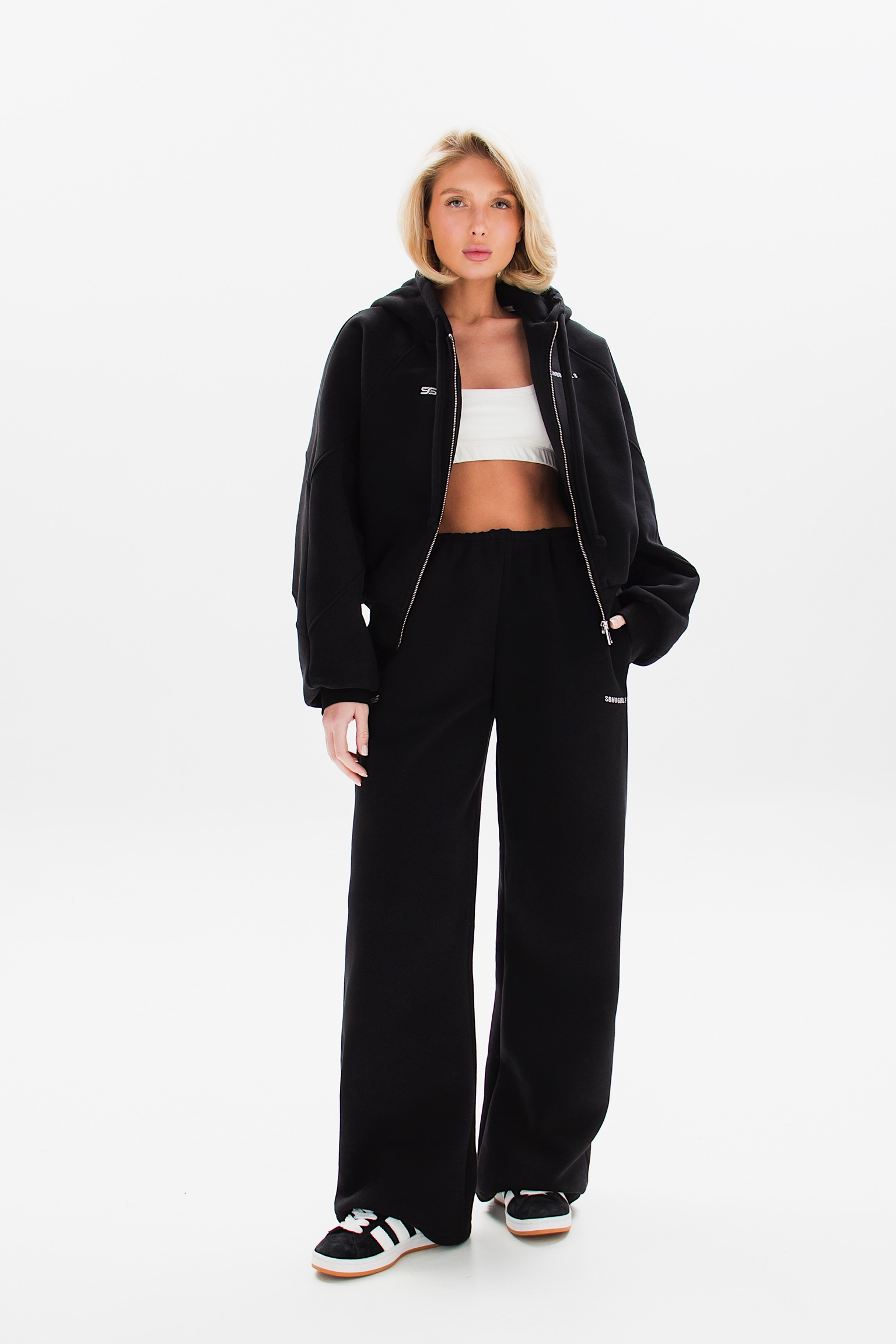 Брюки можно носить как классические палаццо или трансформировать в стильные джоггеры, используя скрытые фиксаторы снизу. Такой функциональный дизайн подойдет для создания различных образов