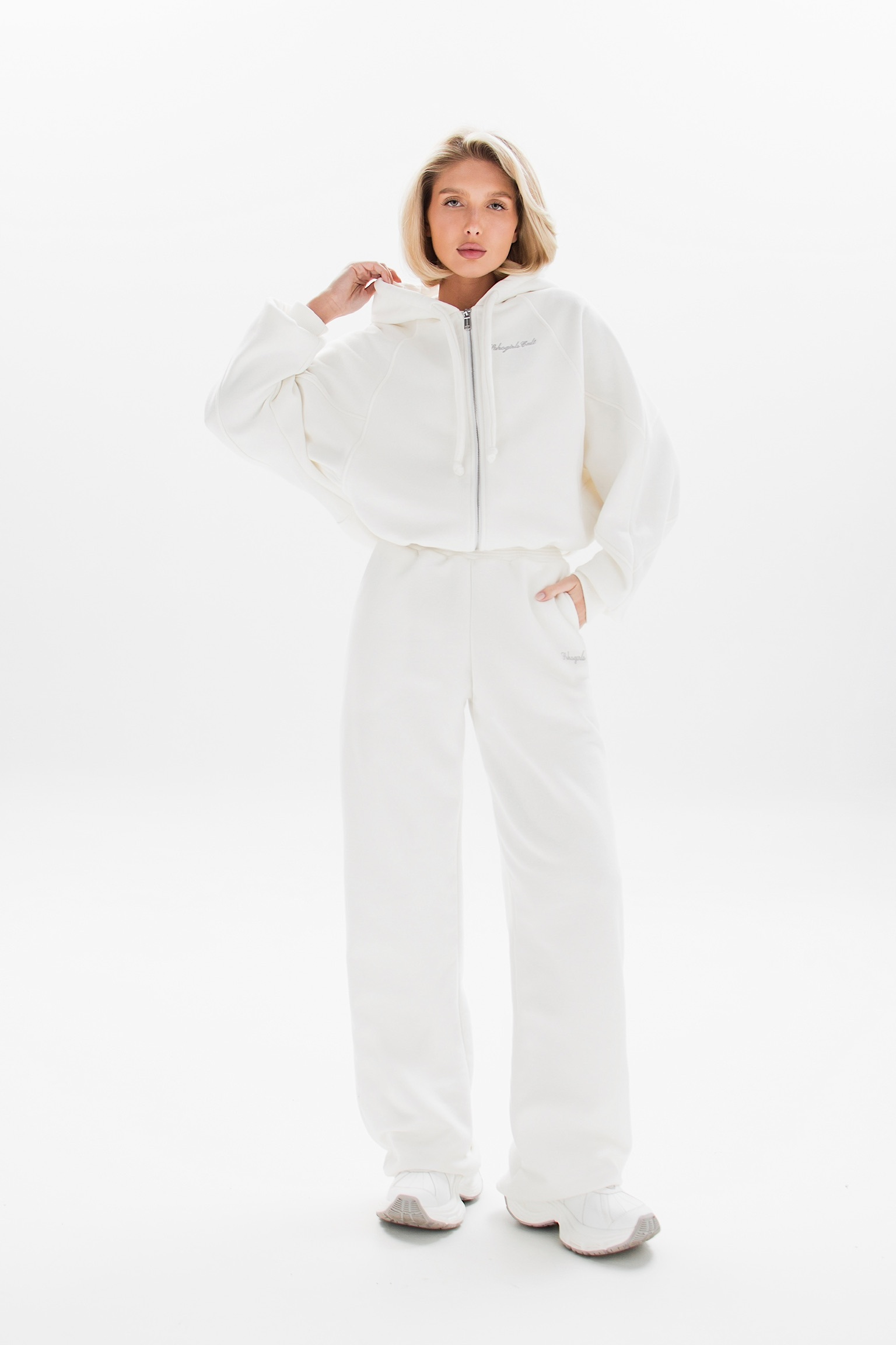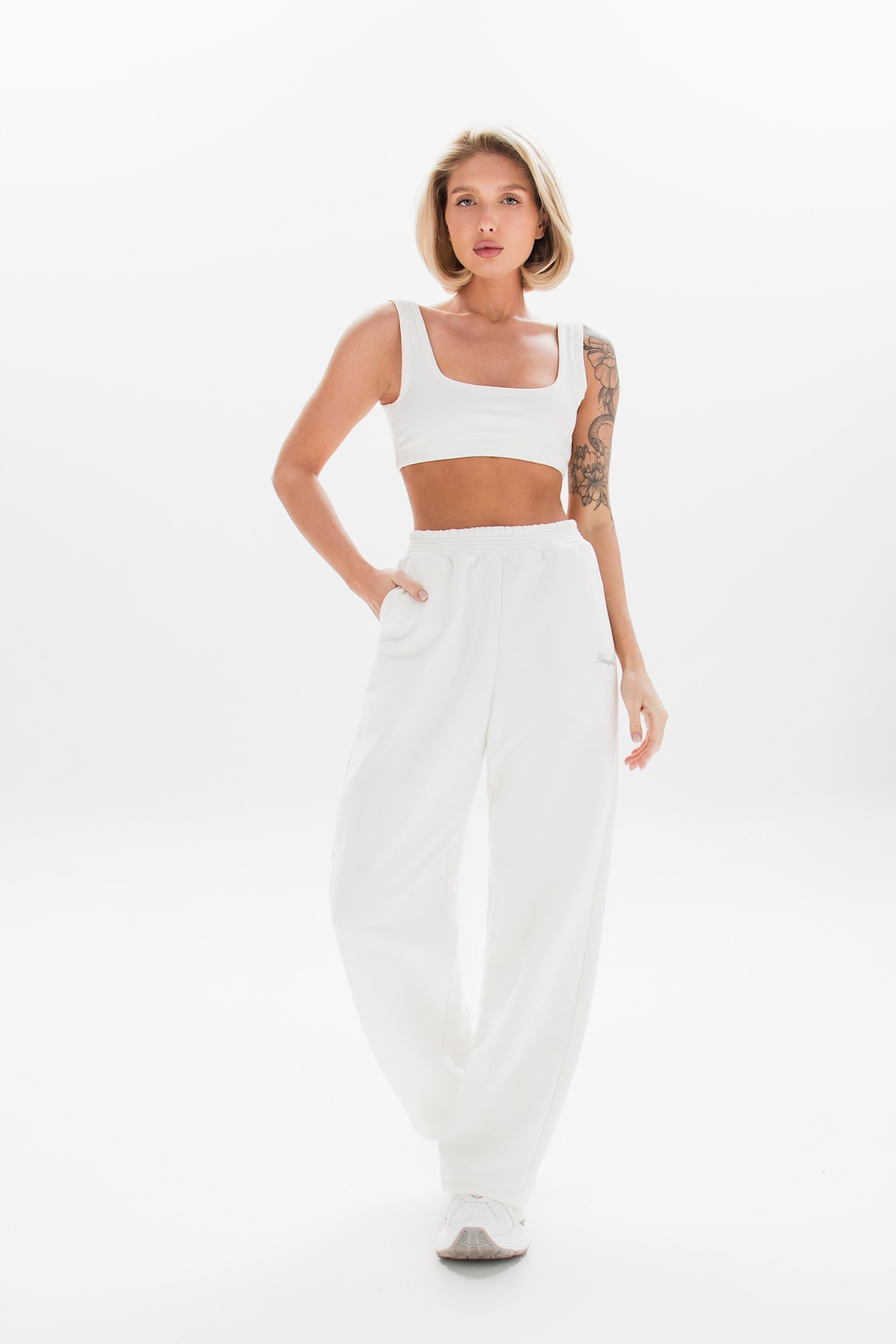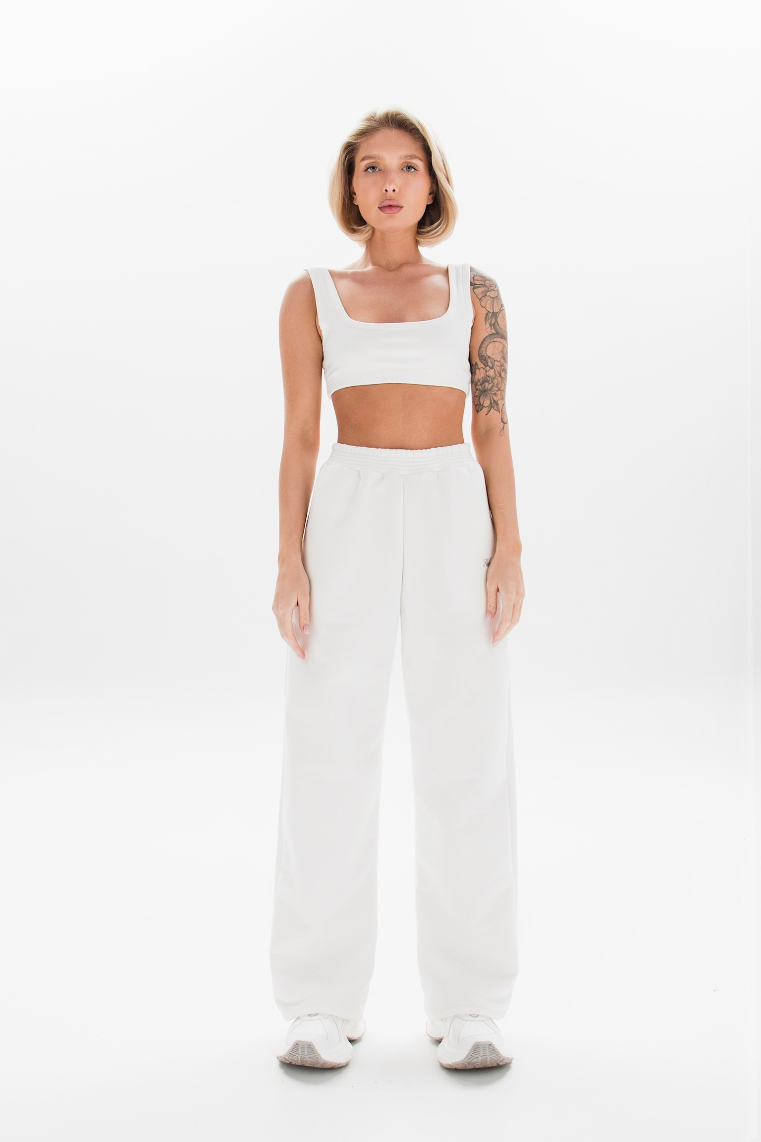 Брюки можно носить как классические палаццо или трансформировать в стильные джоггеры, используя скрытые фиксаторы снизу. Такой функциональный дизайн подойдет для создания различных образов