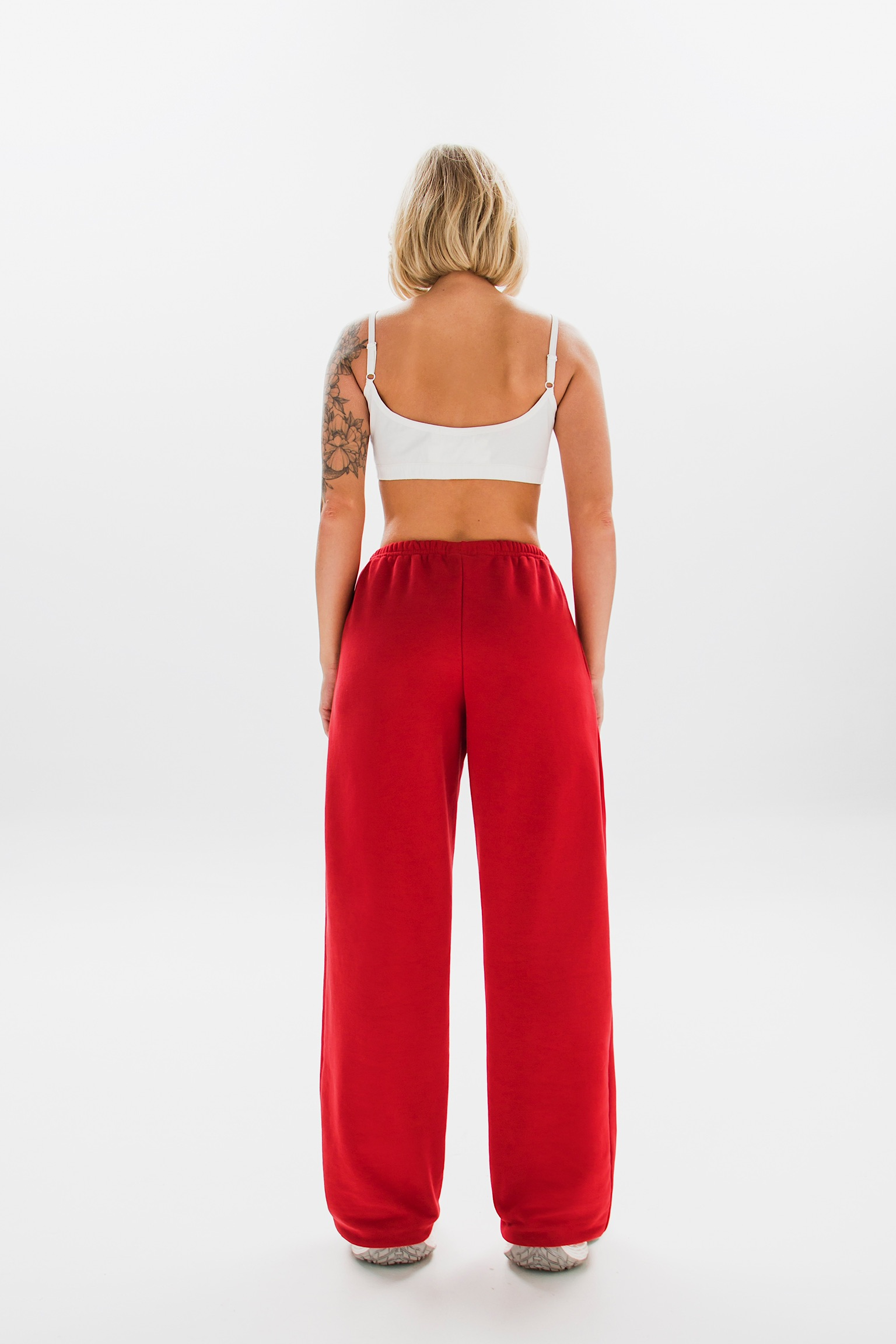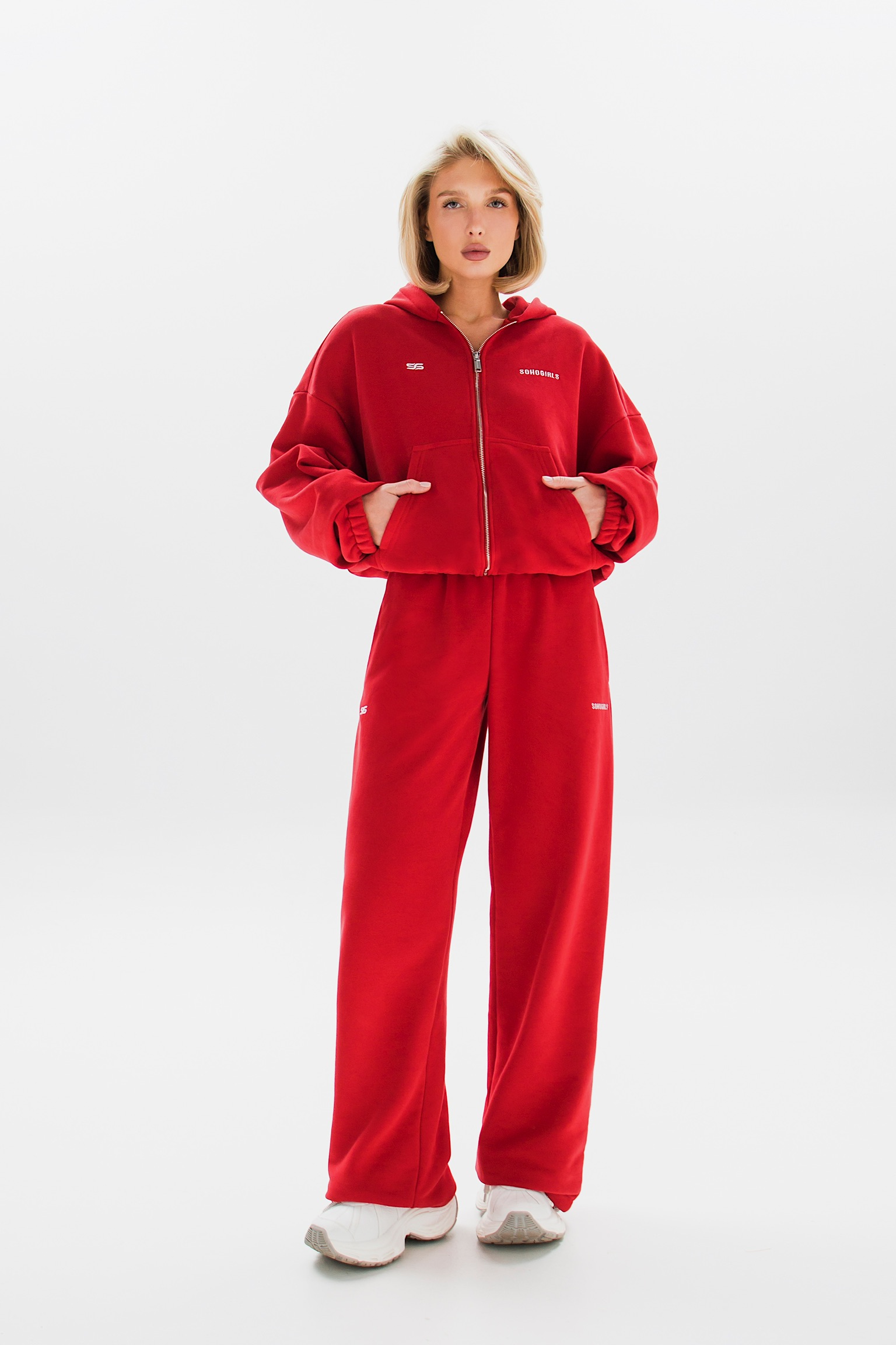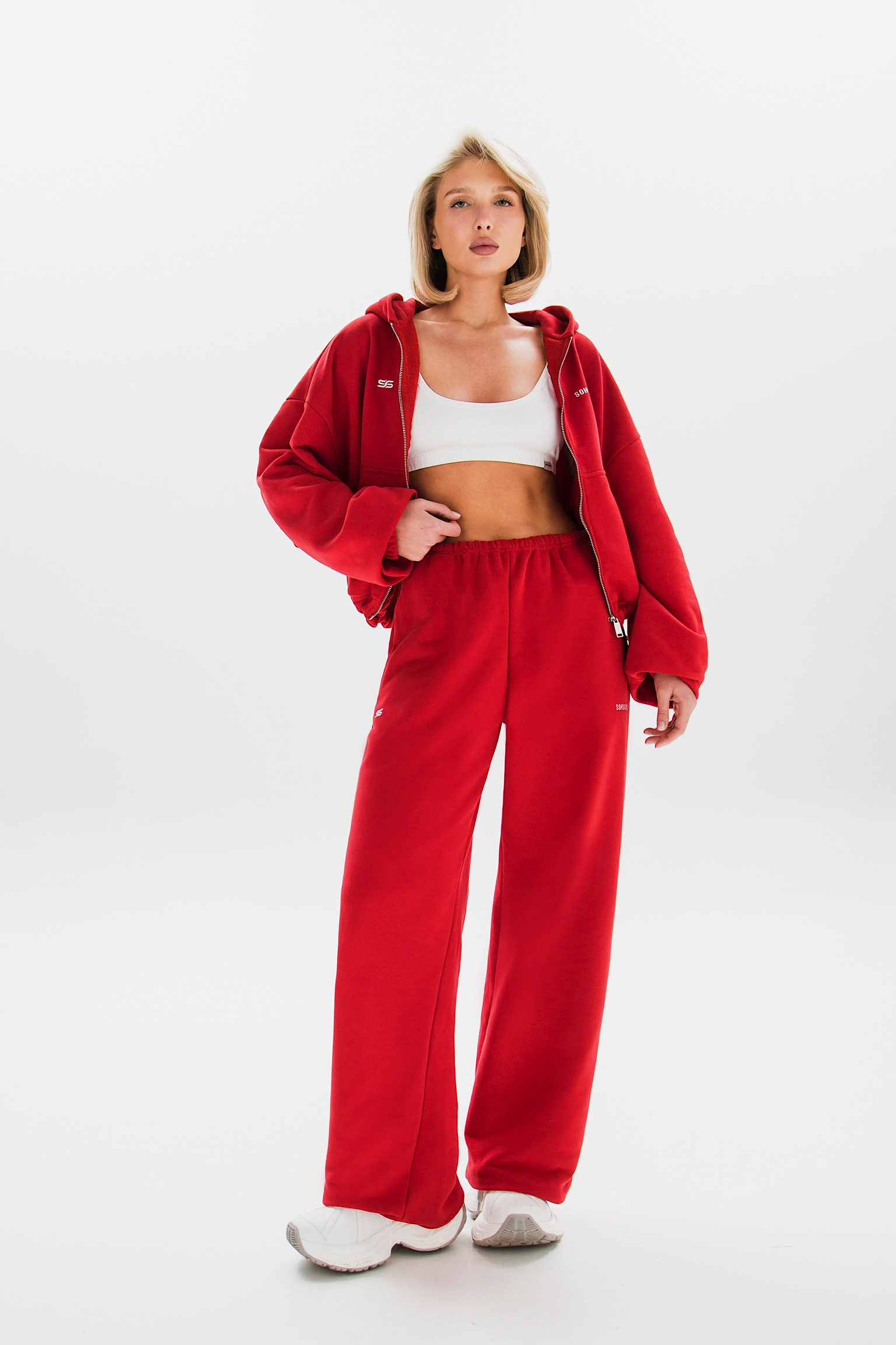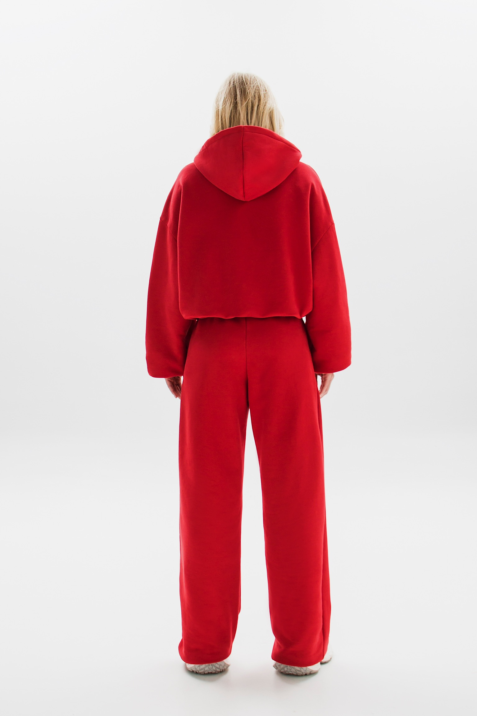Брюки можно носить как классические палаццо или трансформировать в стильные джоггеры, используя скрытые фиксаторы снизу. Такой функциональный дизайн подойдет для создания различных образов