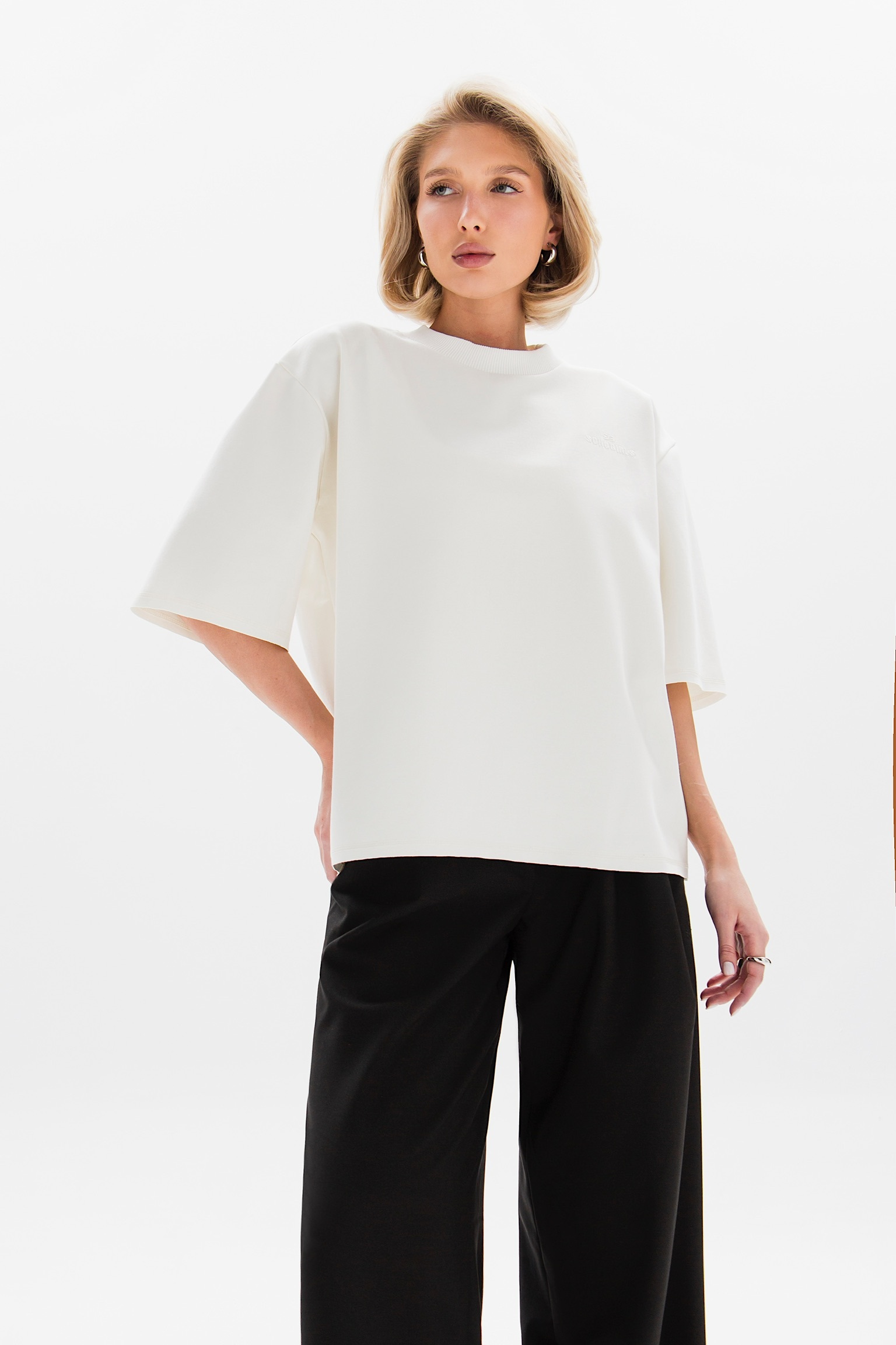 Свободная хлопковая футболка, в которой сочетаются женственность и характер. Лаконичные подплечники формируют аккуратный силуэт и добавляют выразительности образу, сохраняя при этом комфорт и лёгкость посадки.