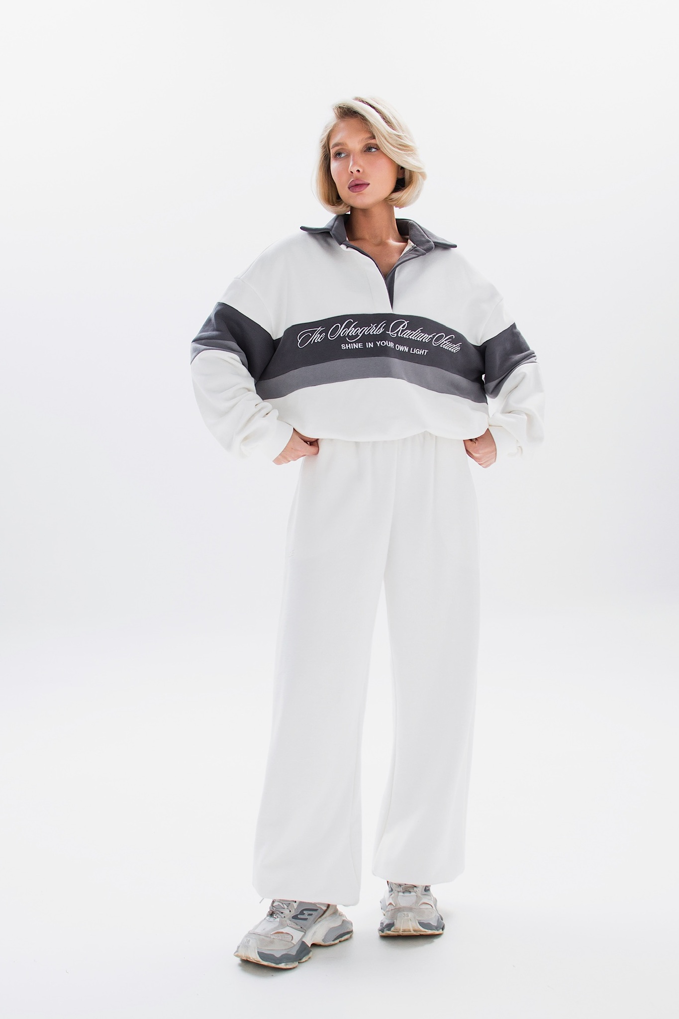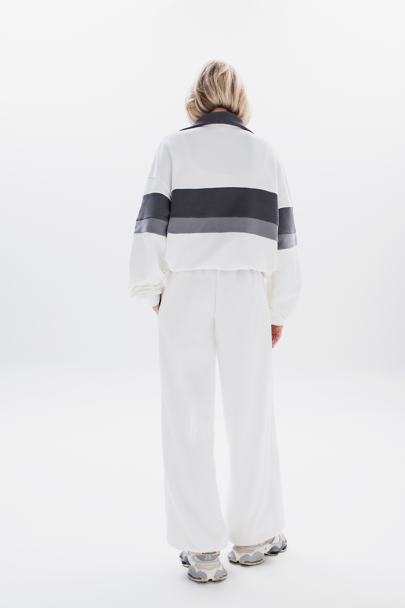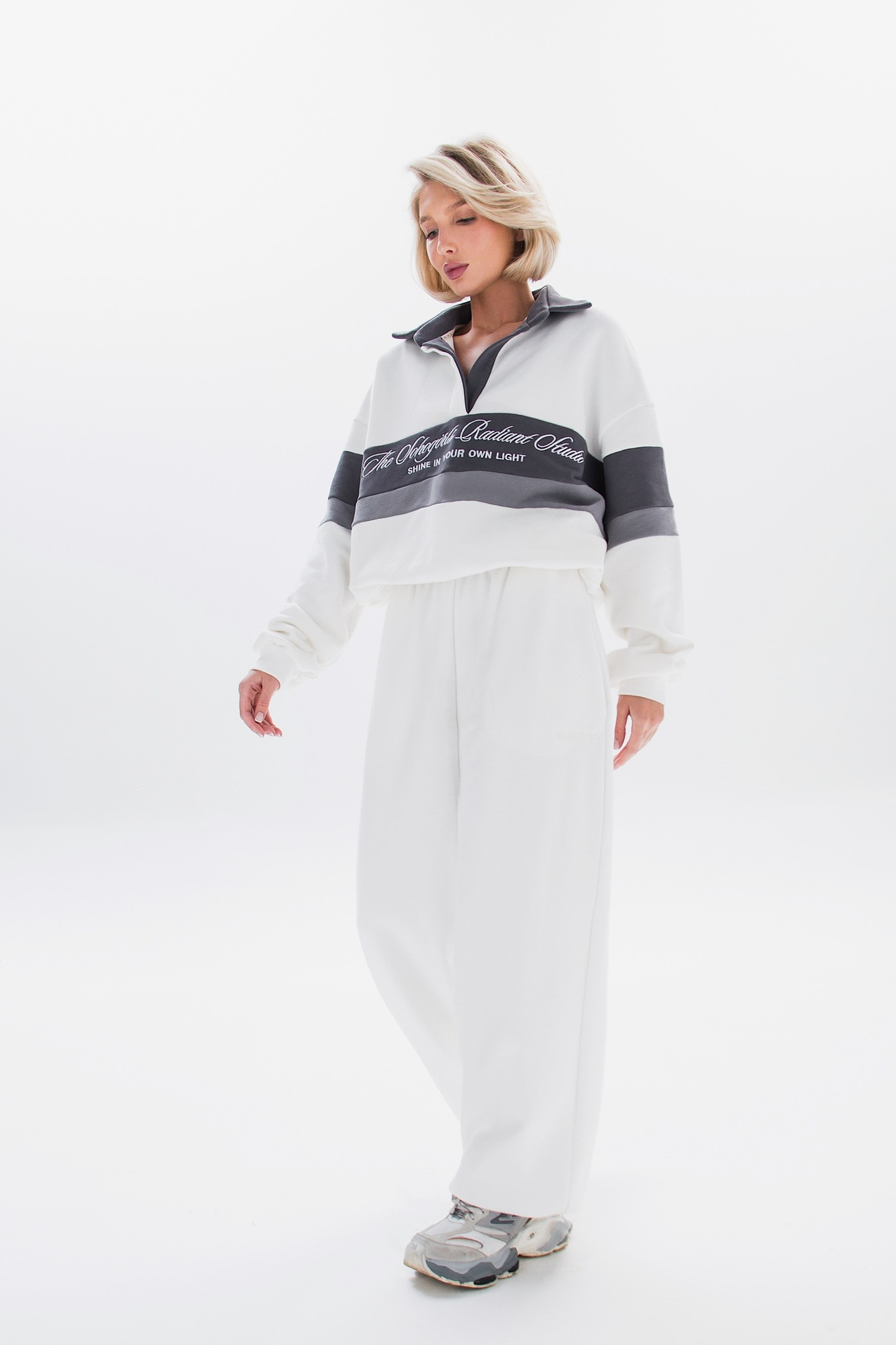 В паре с брюками костюм выглядит стильно и универсально - подойдёт и для повседневных образов, и для спортивного настроения.
