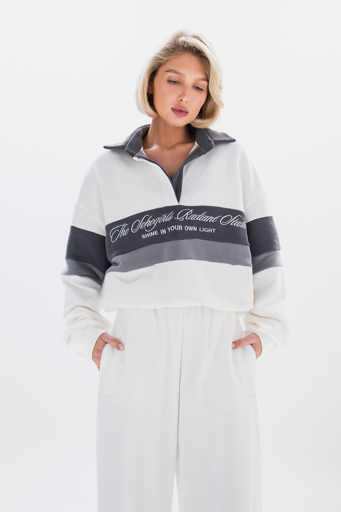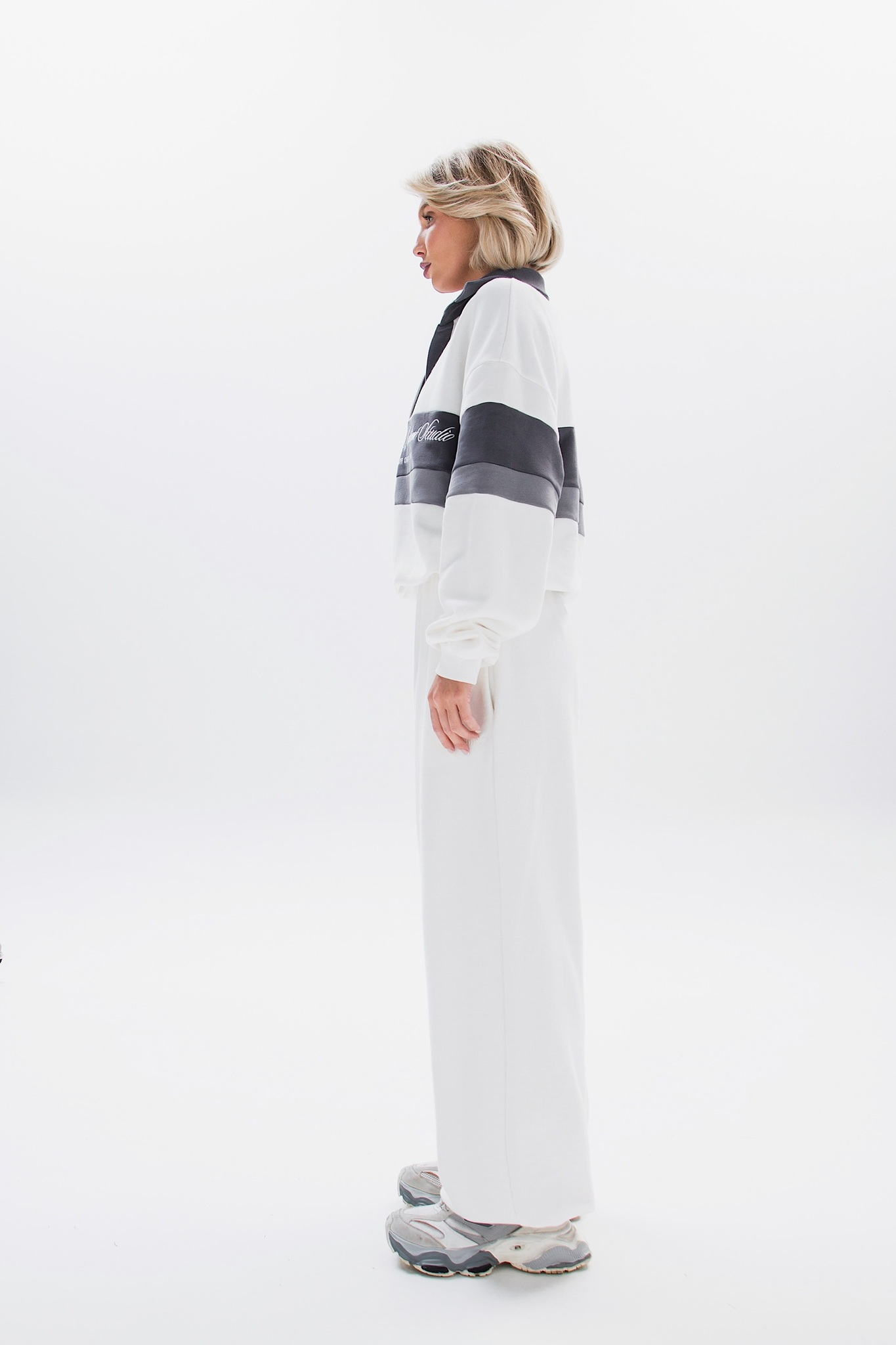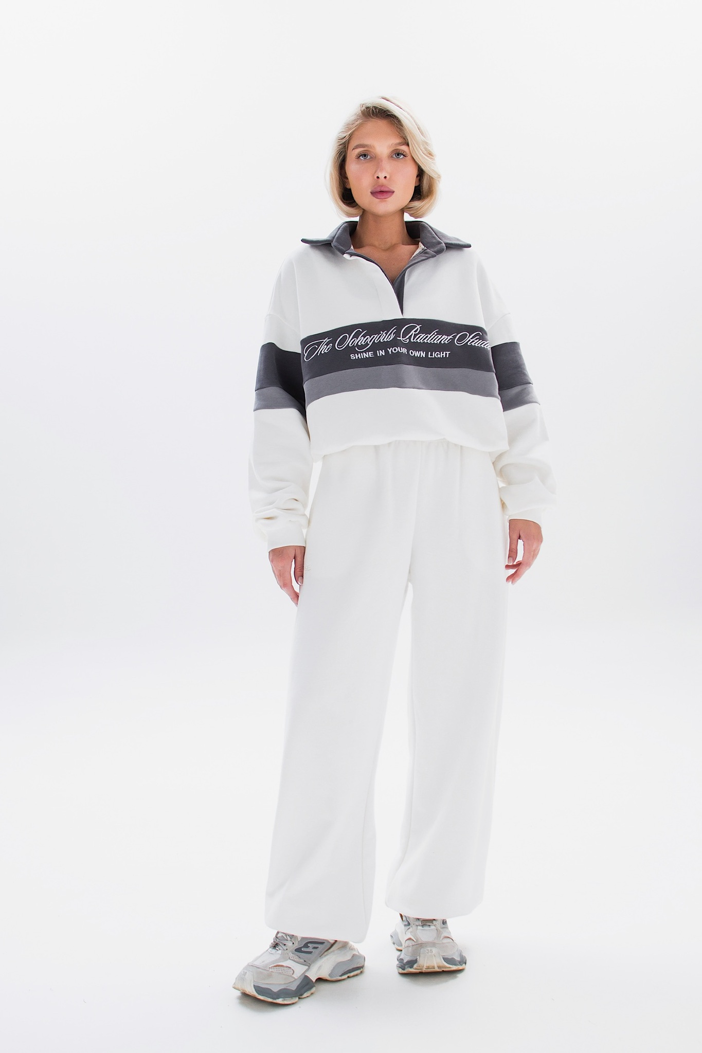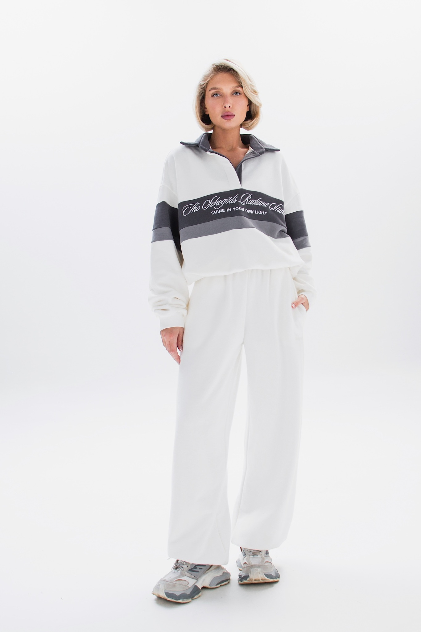 В паре с брюками костюм выглядит стильно и универсально - подойдёт и для повседневных образов, и для спортивного настроения.