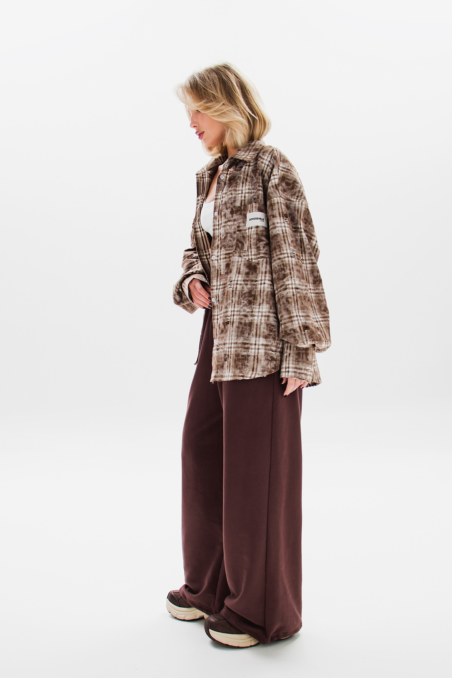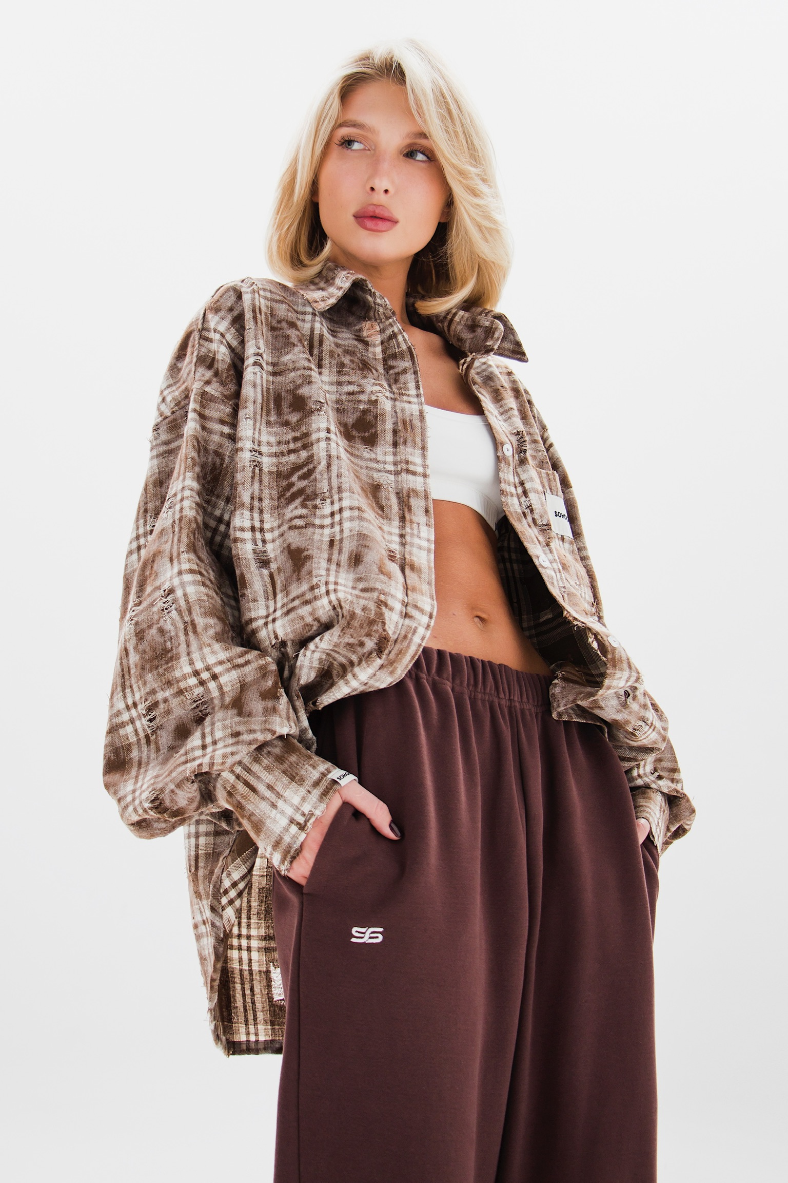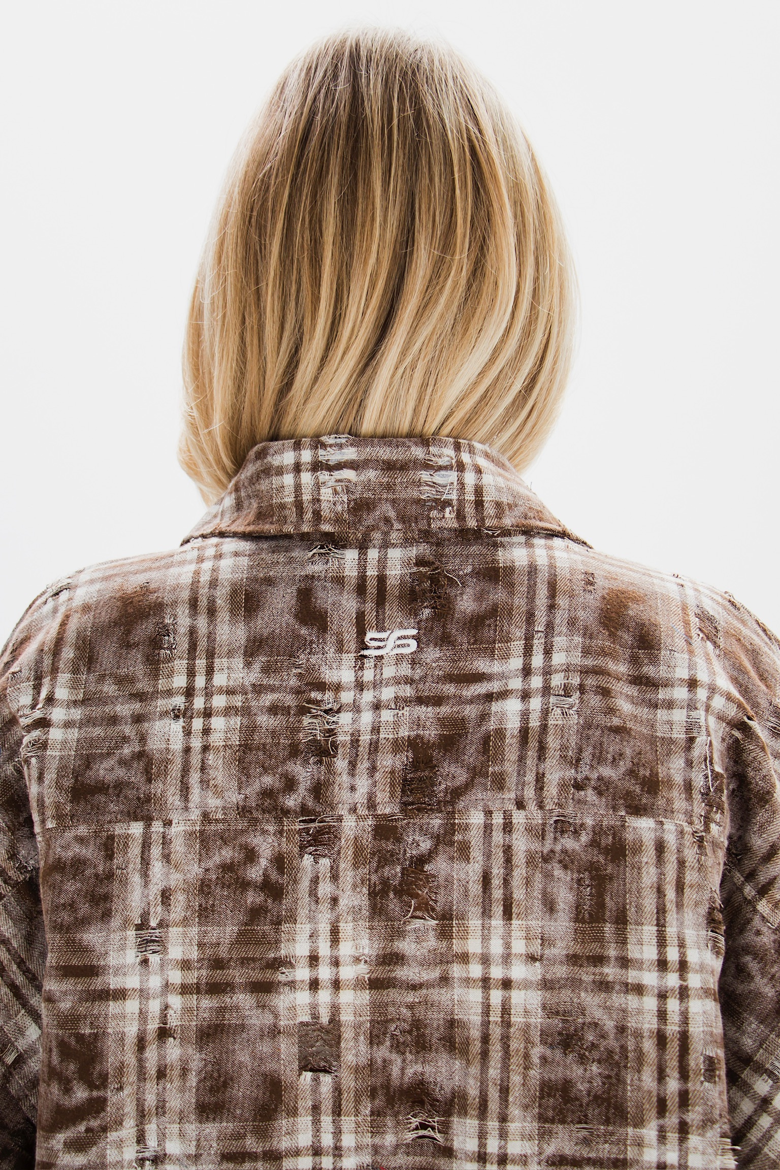 Рубашка в клетку с эффектом легкой потертости в свободном крое и со спущенной линией плеч.