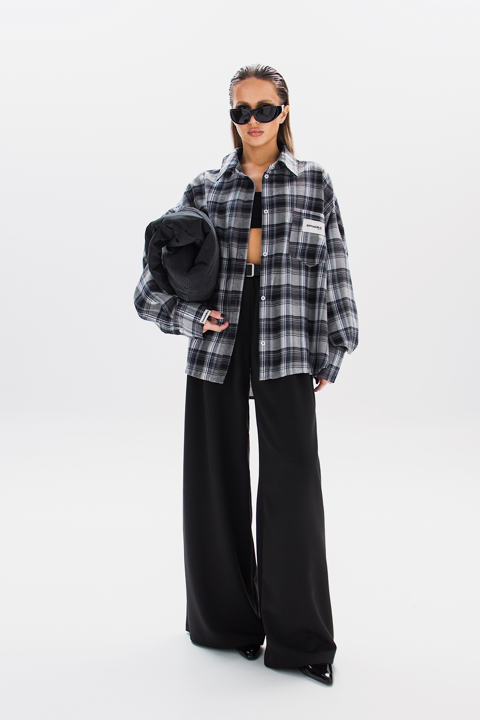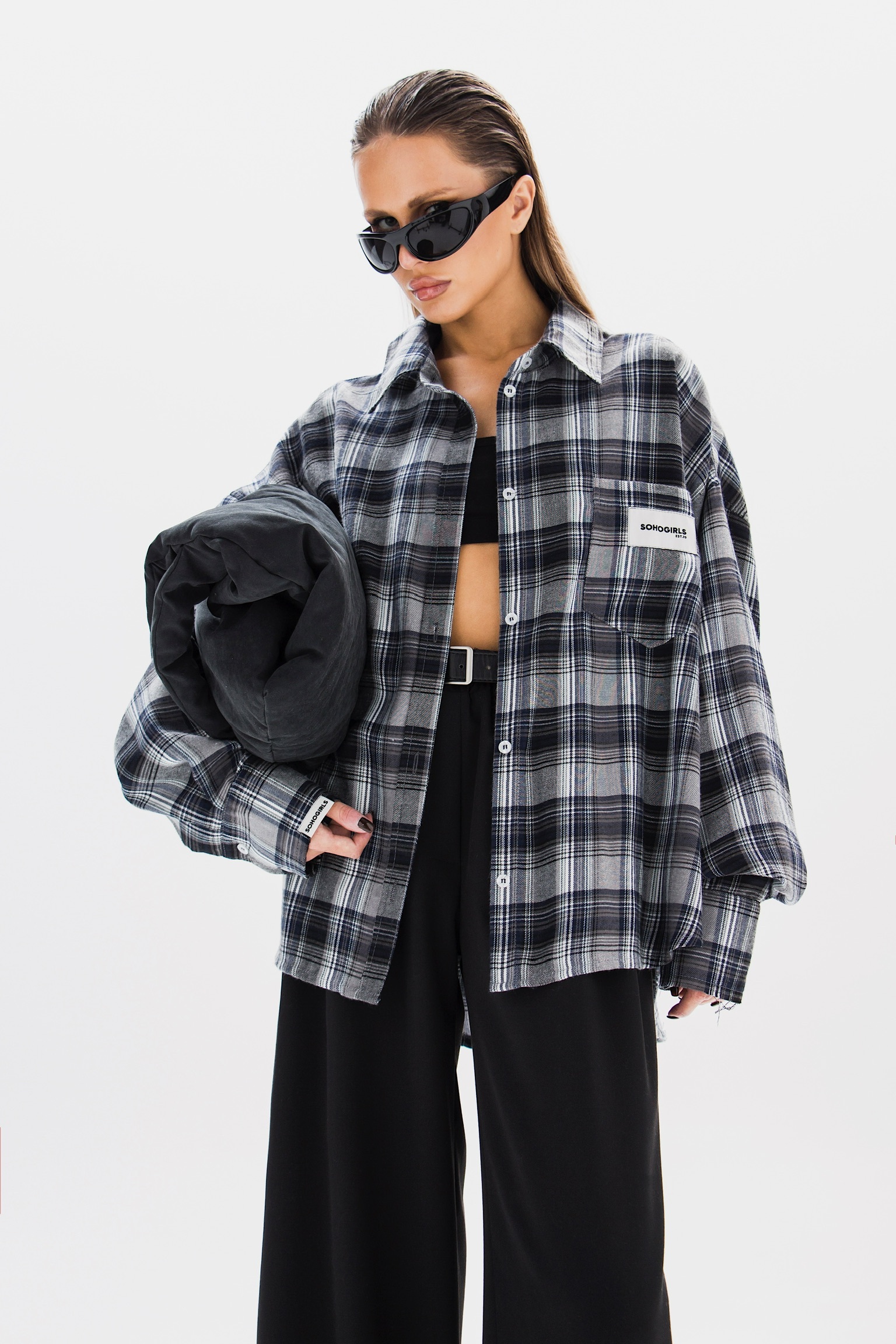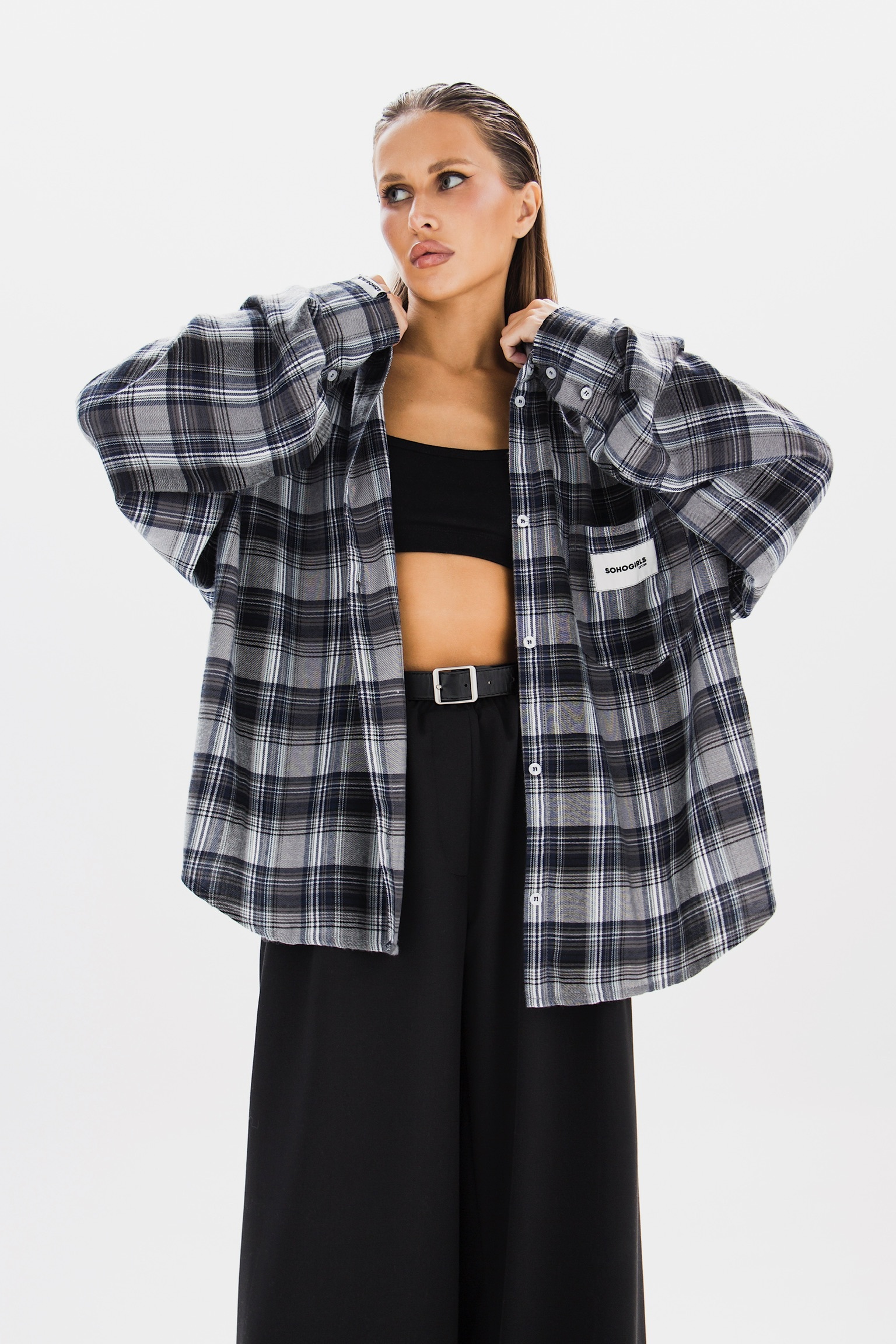 Рубашка в клетку в свободном крое и со спущенной линией плеч.