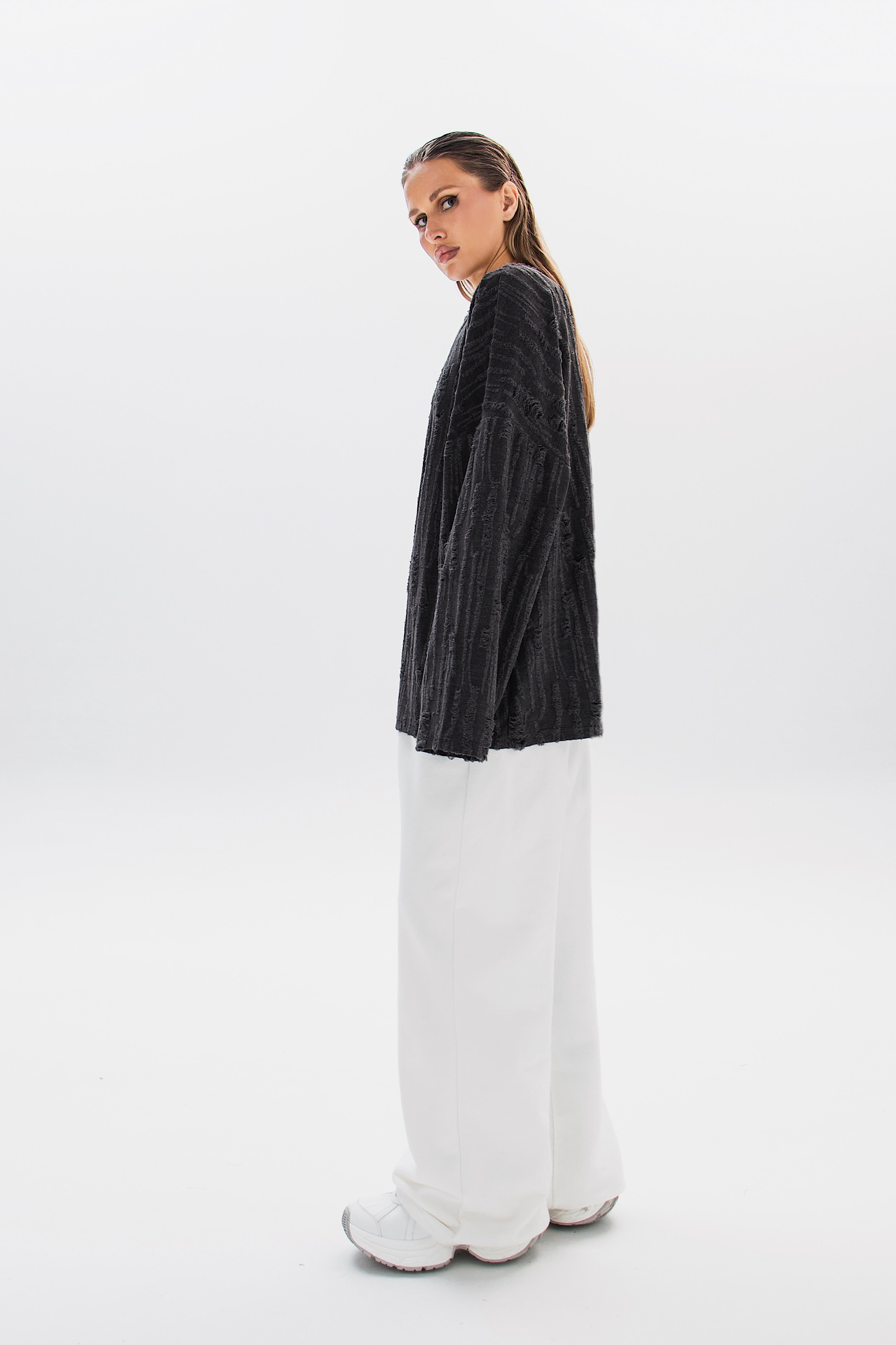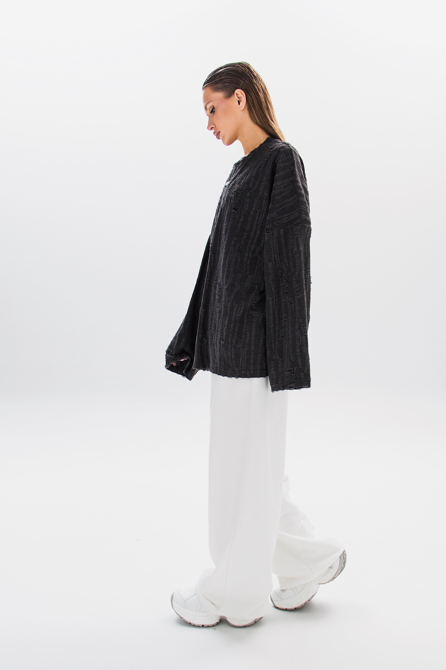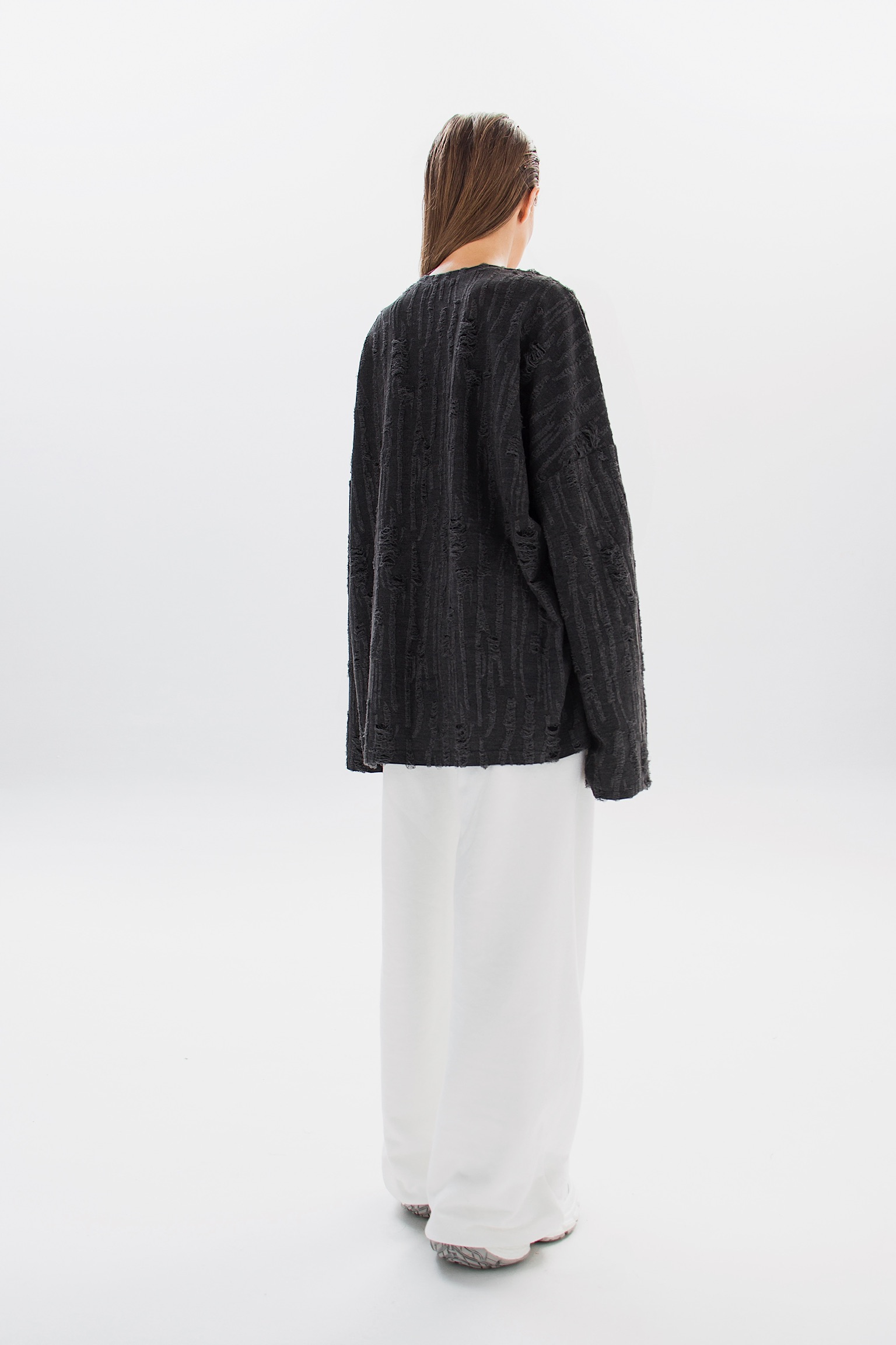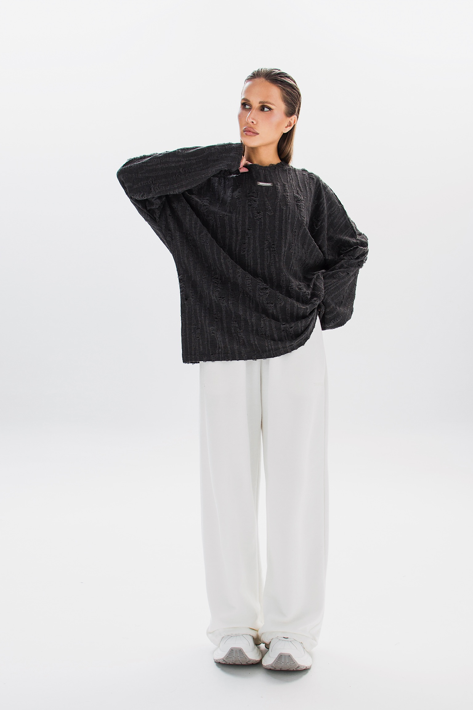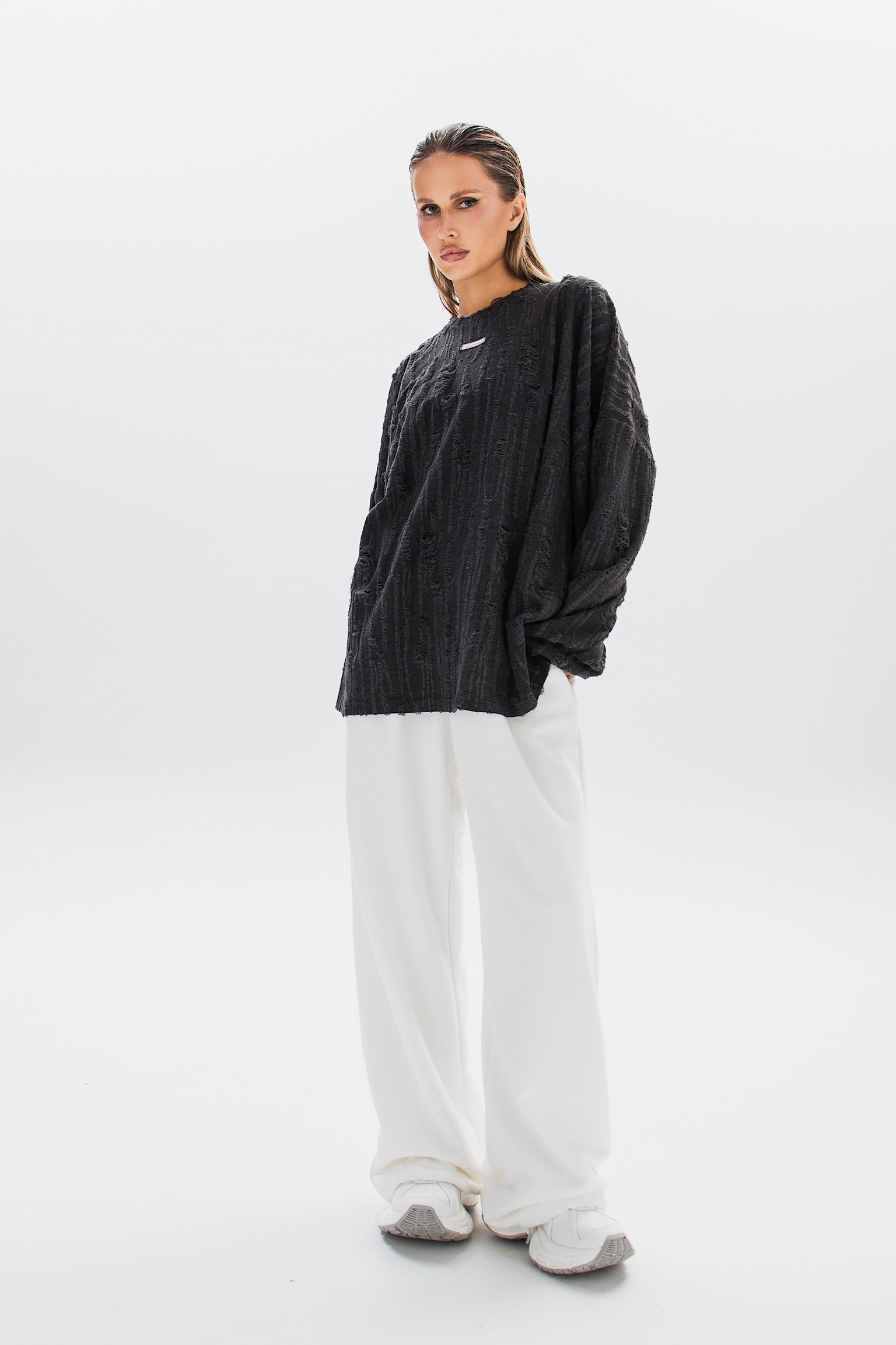 Свитшот RUFFURE с гранжевыми элементами и эффектами потертостей. Свободный крой и минималистичная бирка на груди создают стильный и непринужденный образ.
