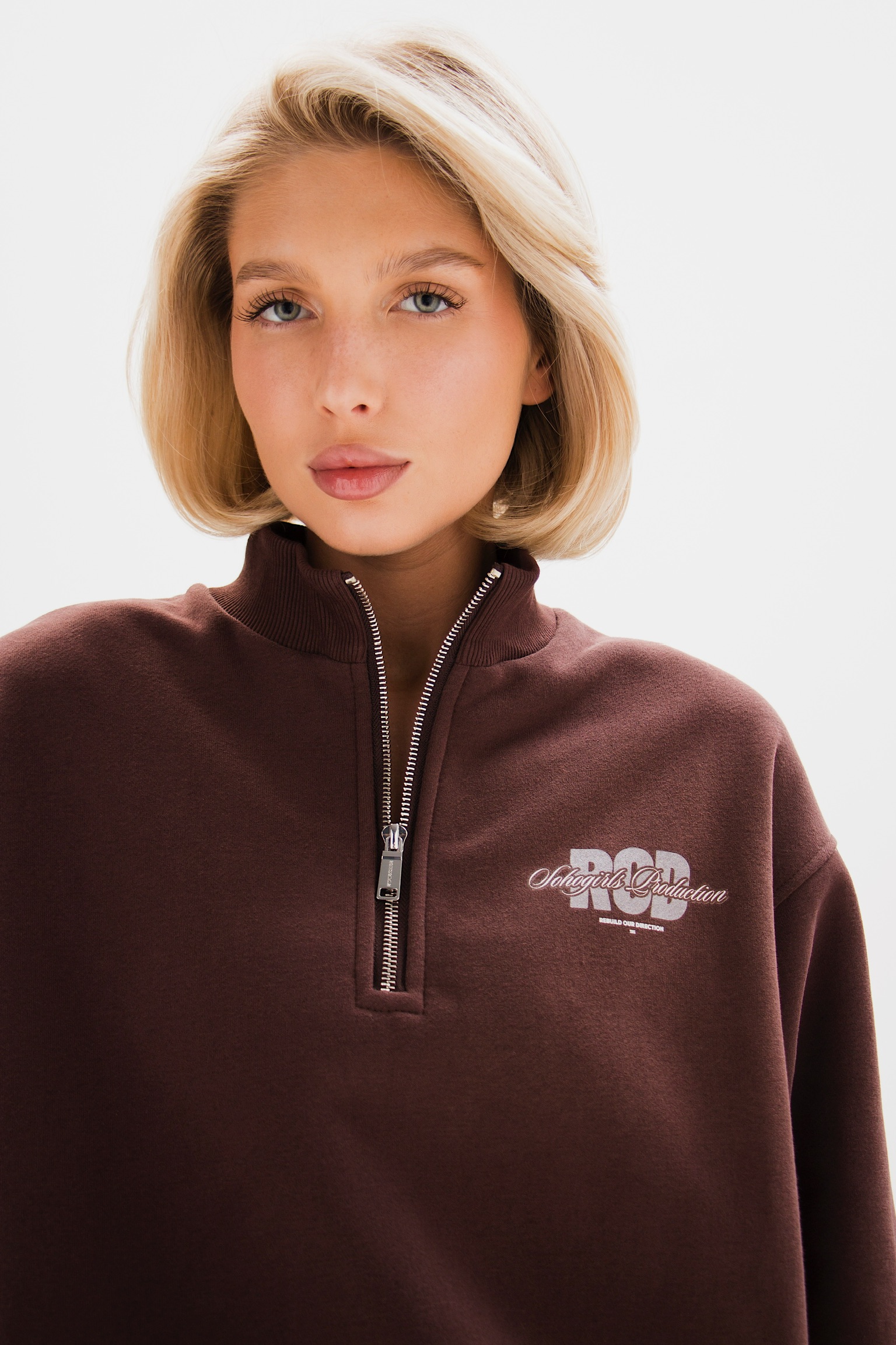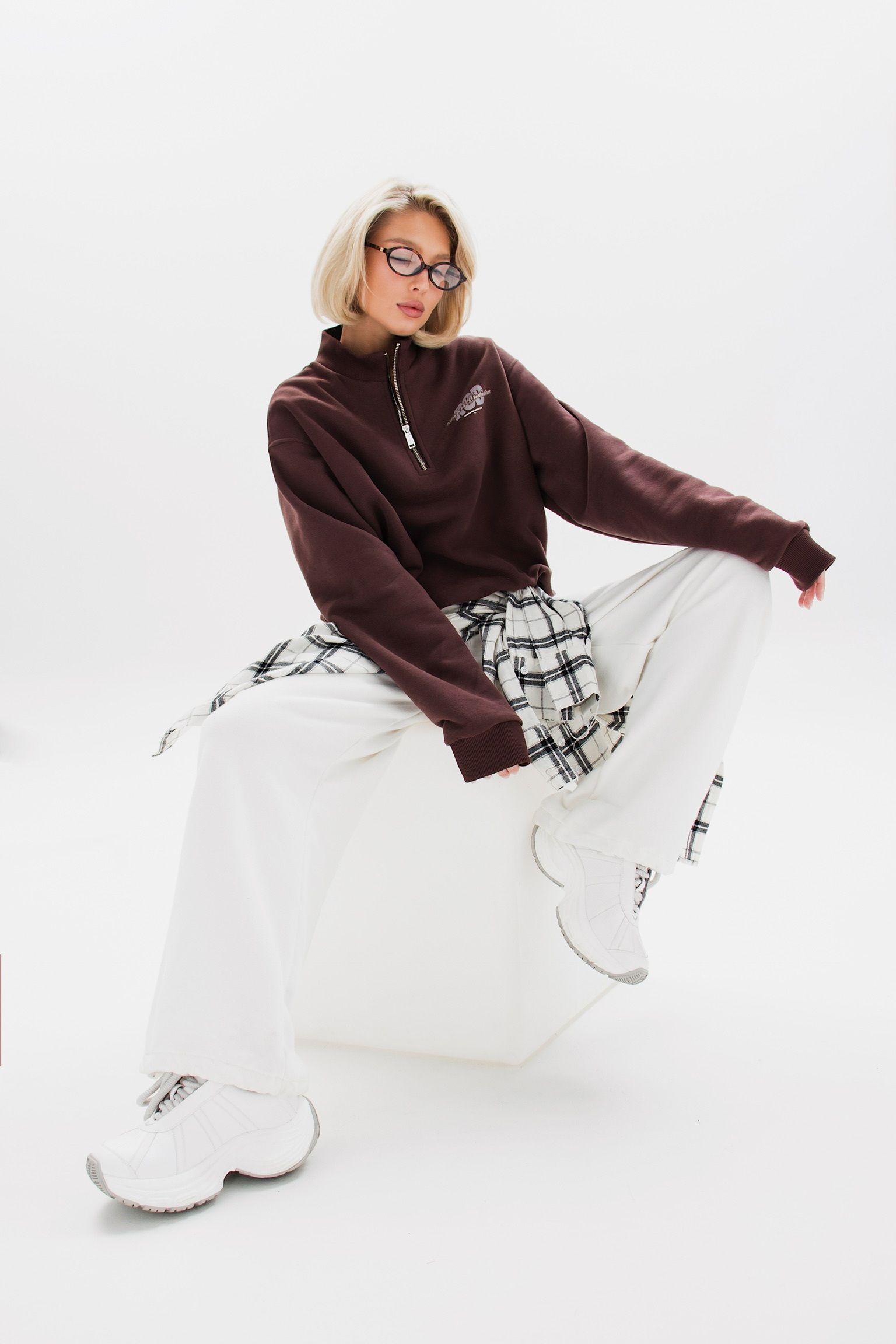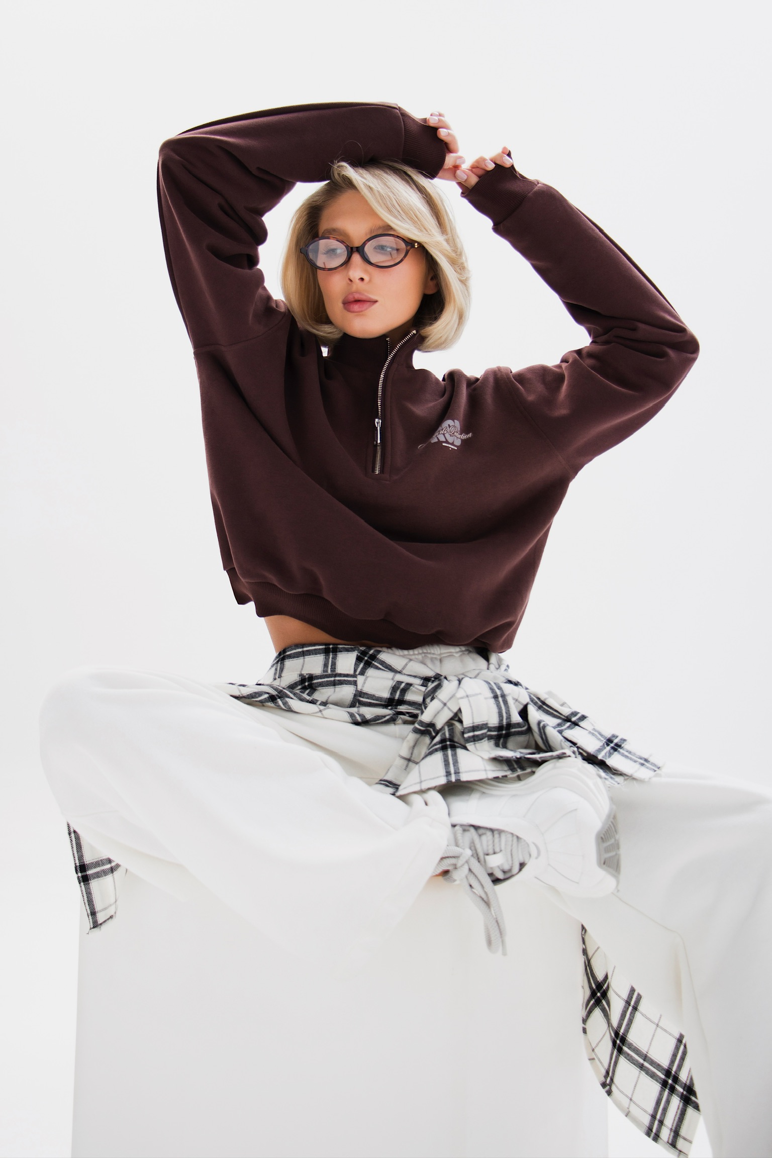 Свитшот свободного кроя выполнен из мягкой приятной ткани с принтом на груди и молнией