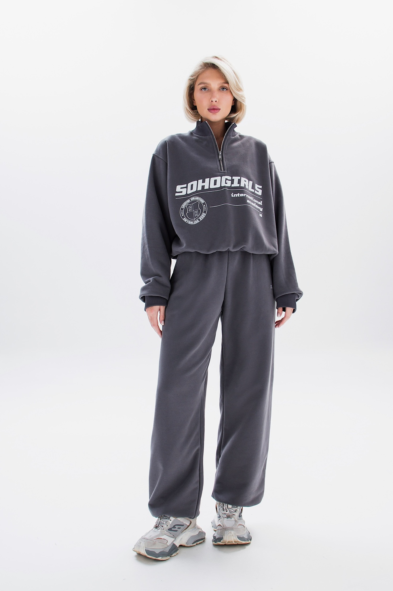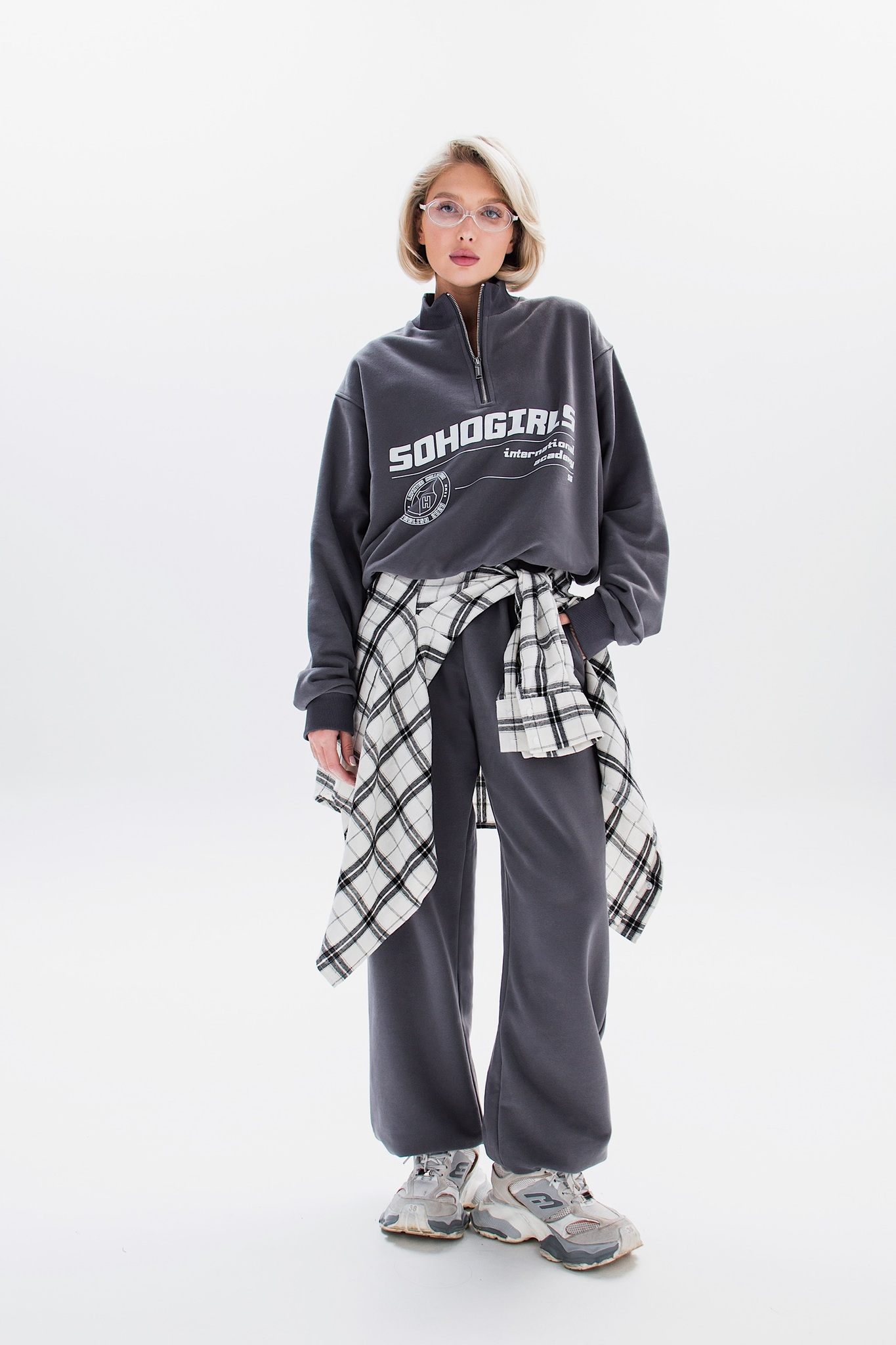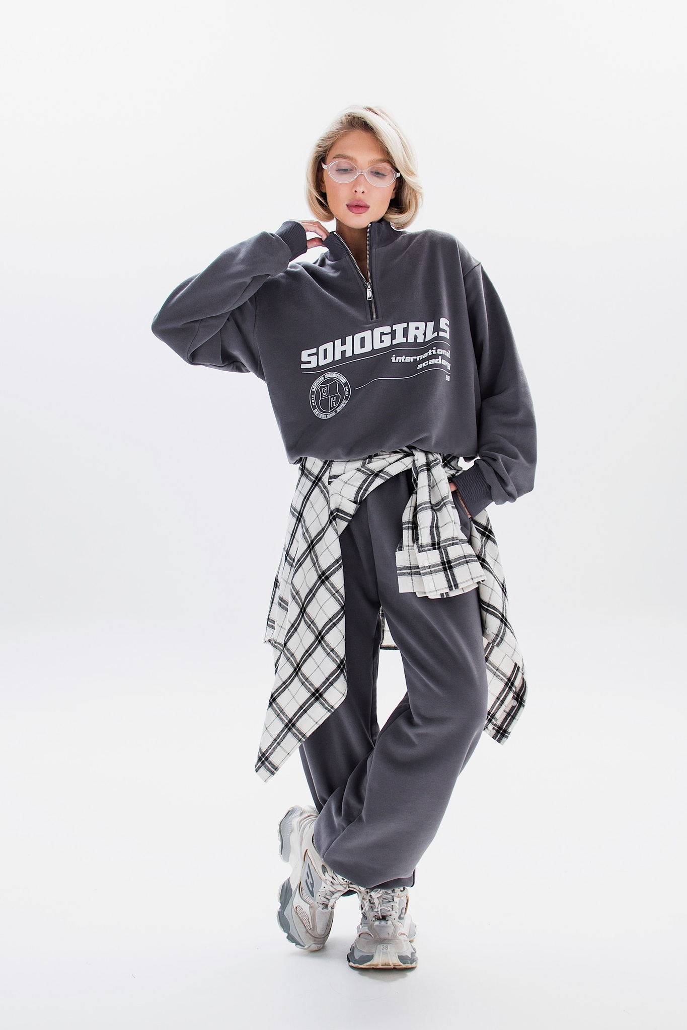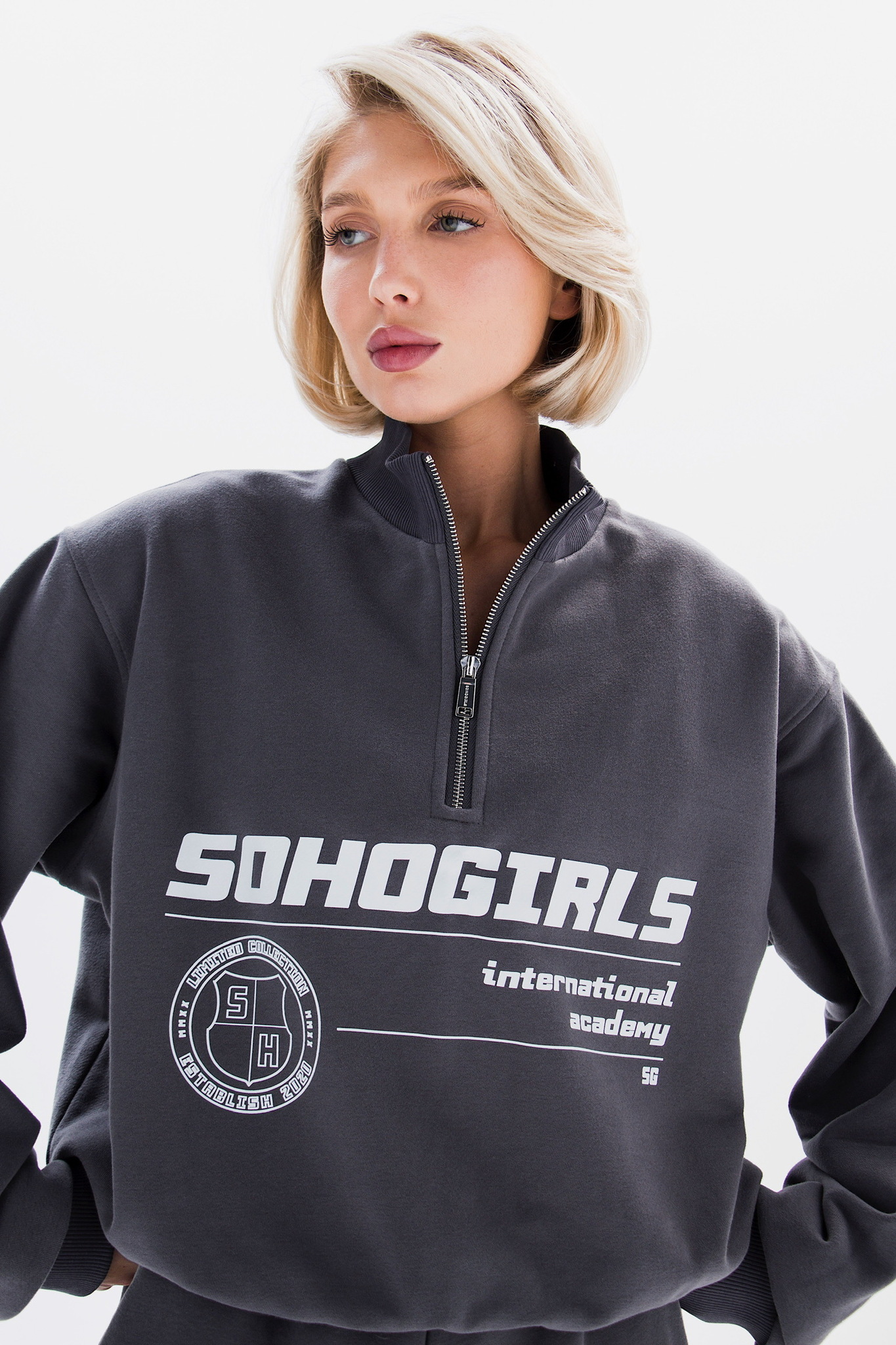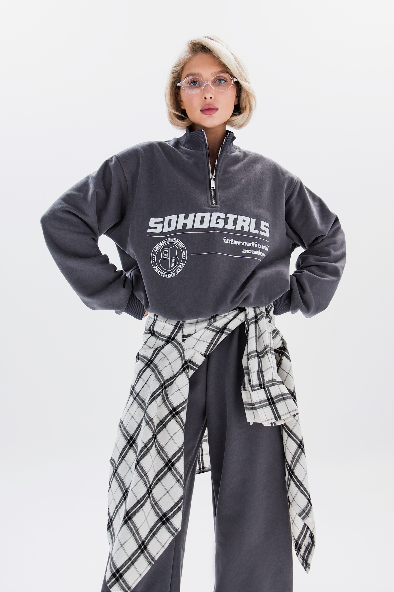 Свитшот свободного кроя выполнен из мягкой приятной ткани с принтом на груди и молнией.