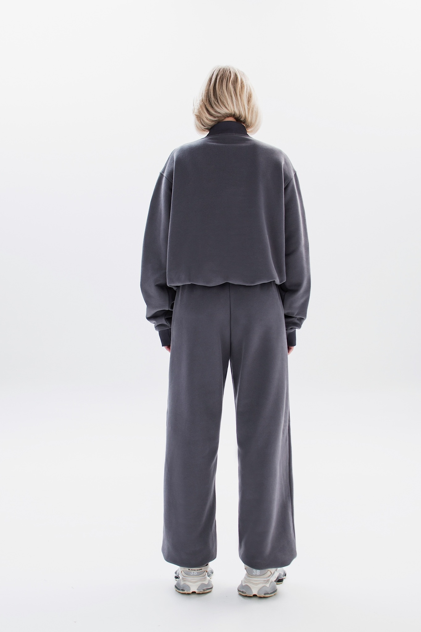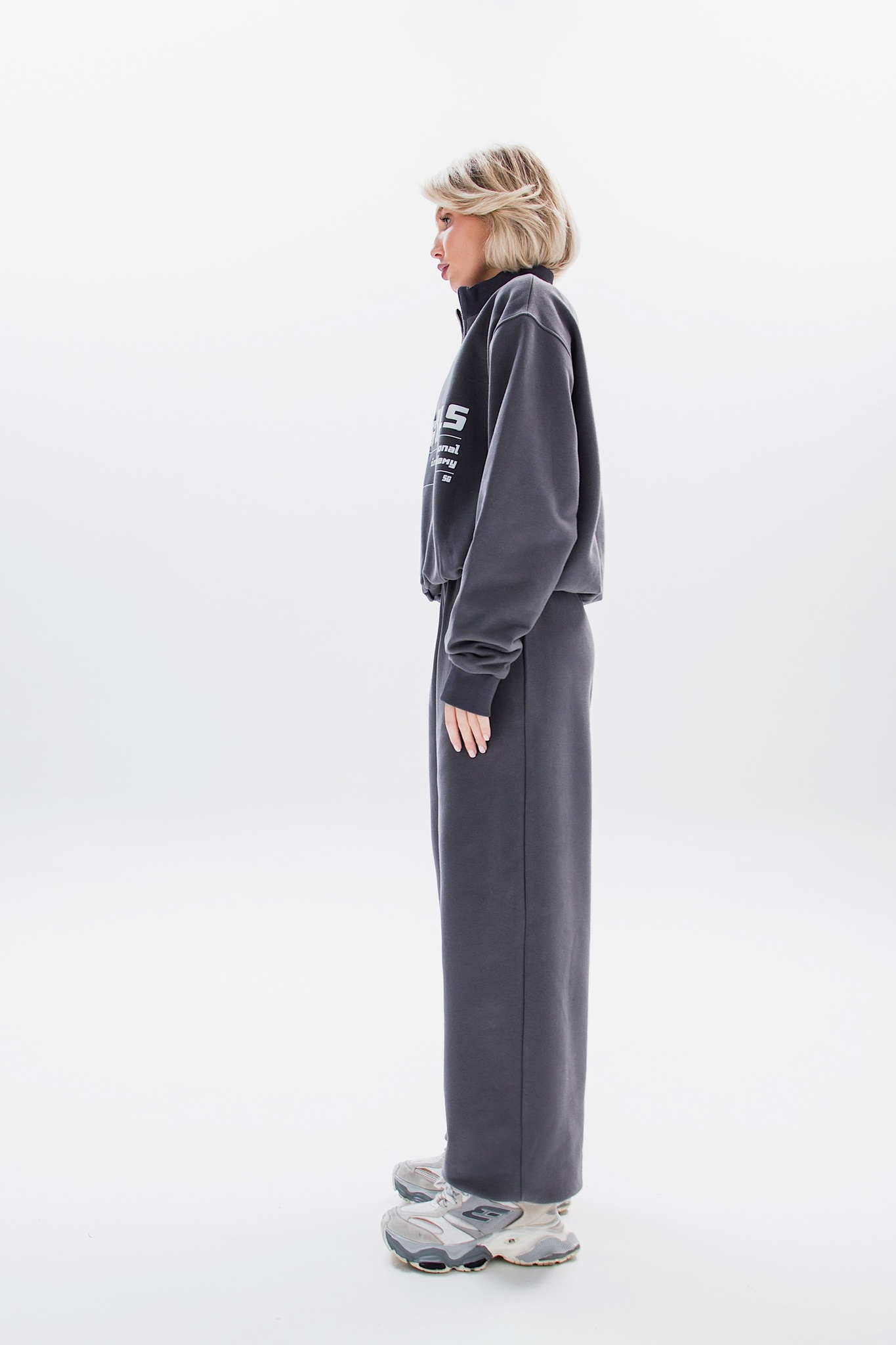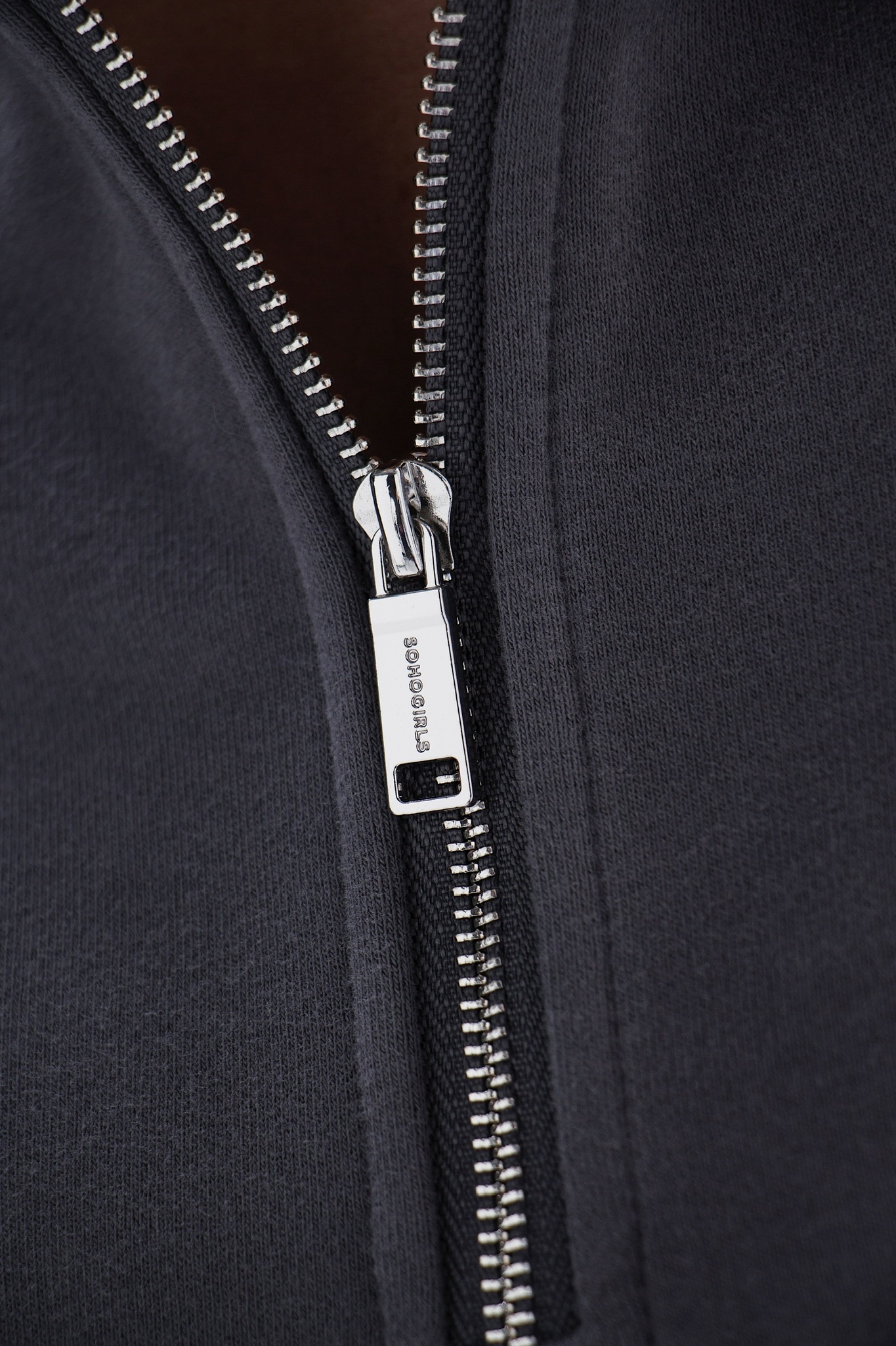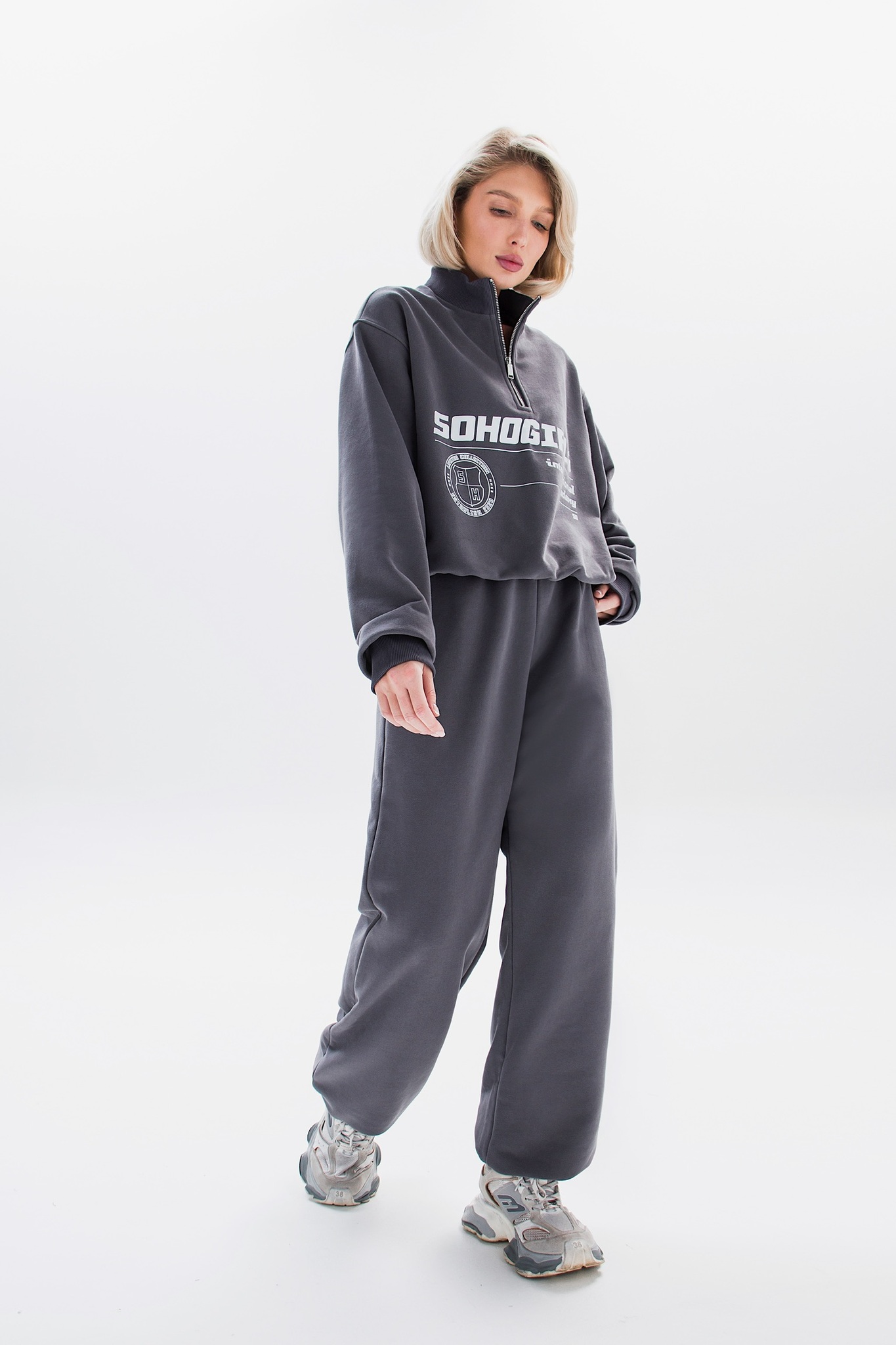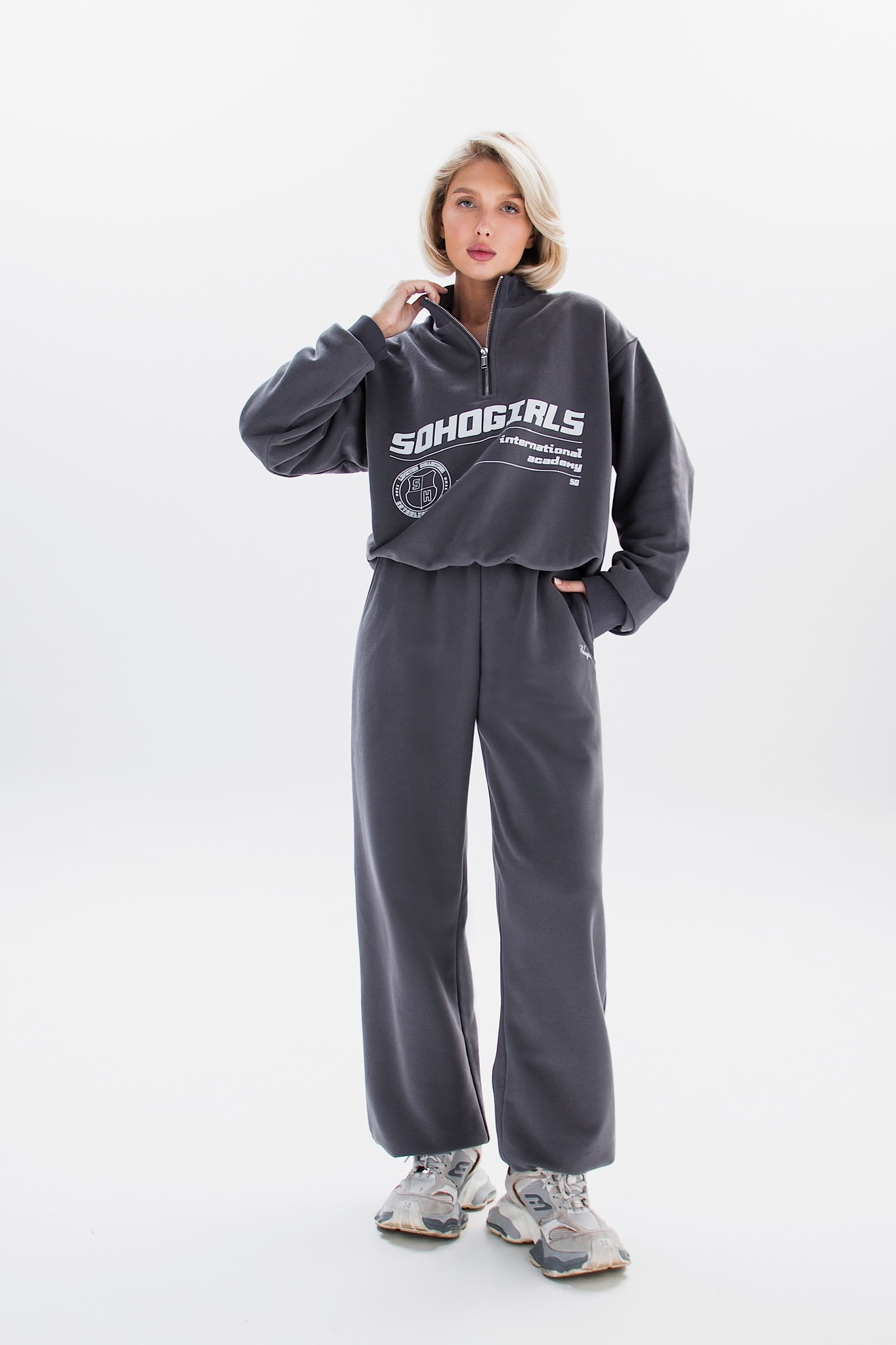 Свитшот свободного кроя выполнен из мягкой приятной ткани с принтом на груди и молнией.