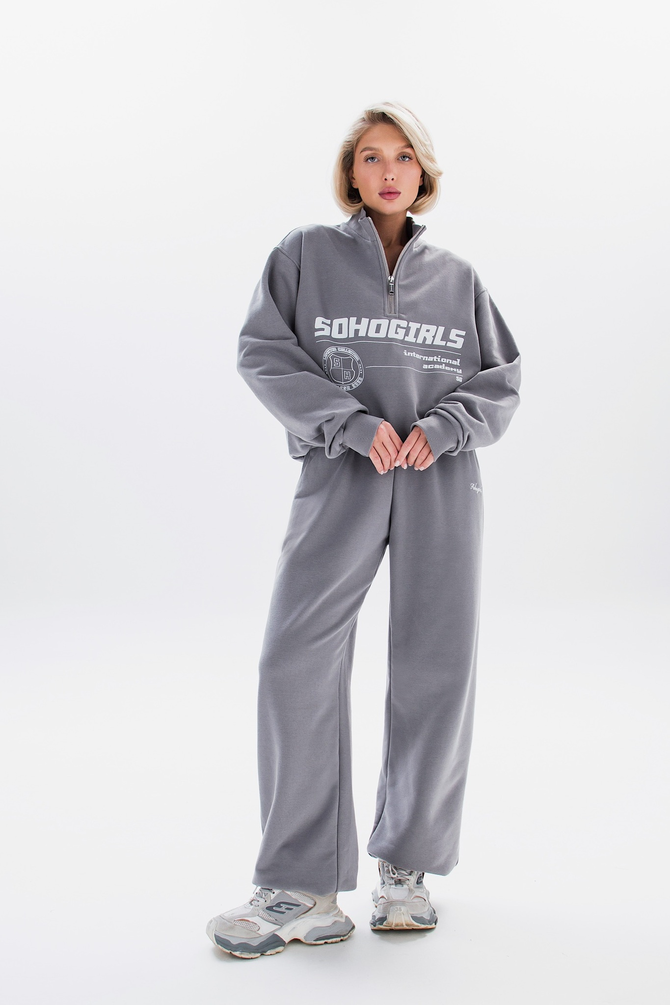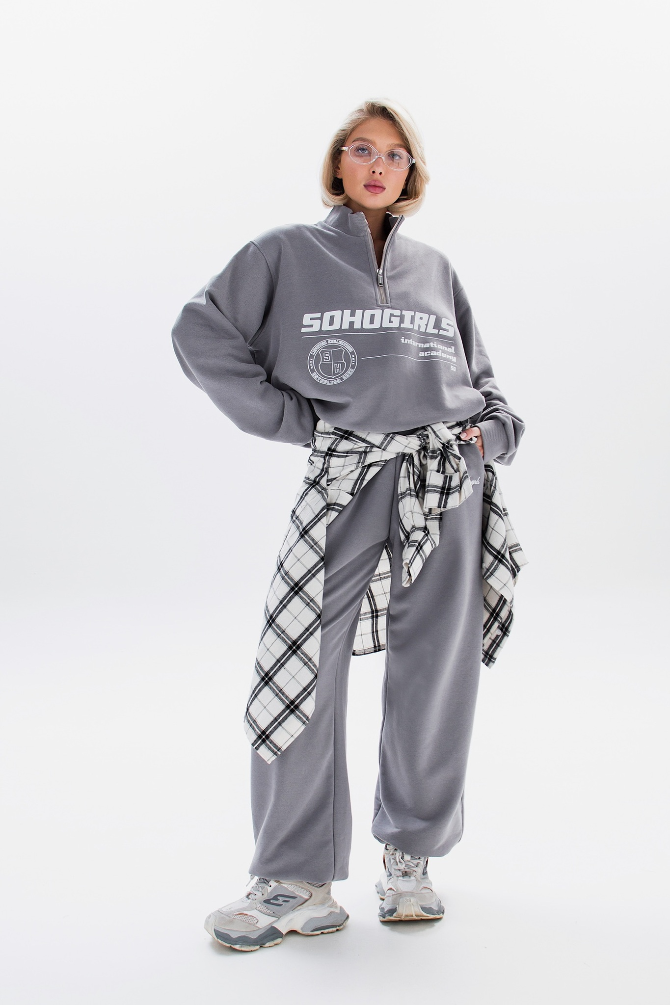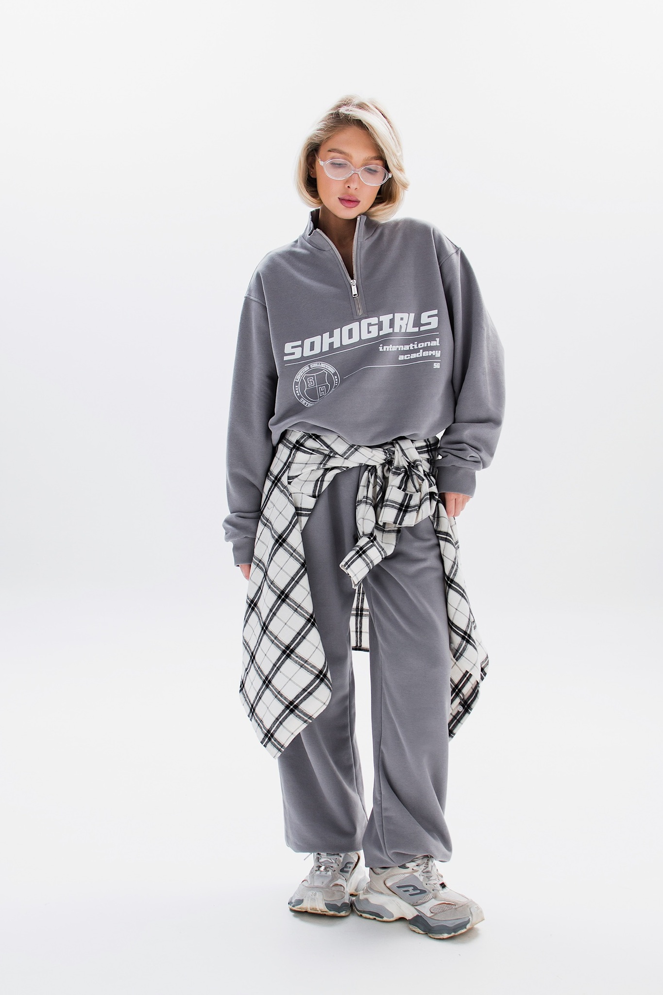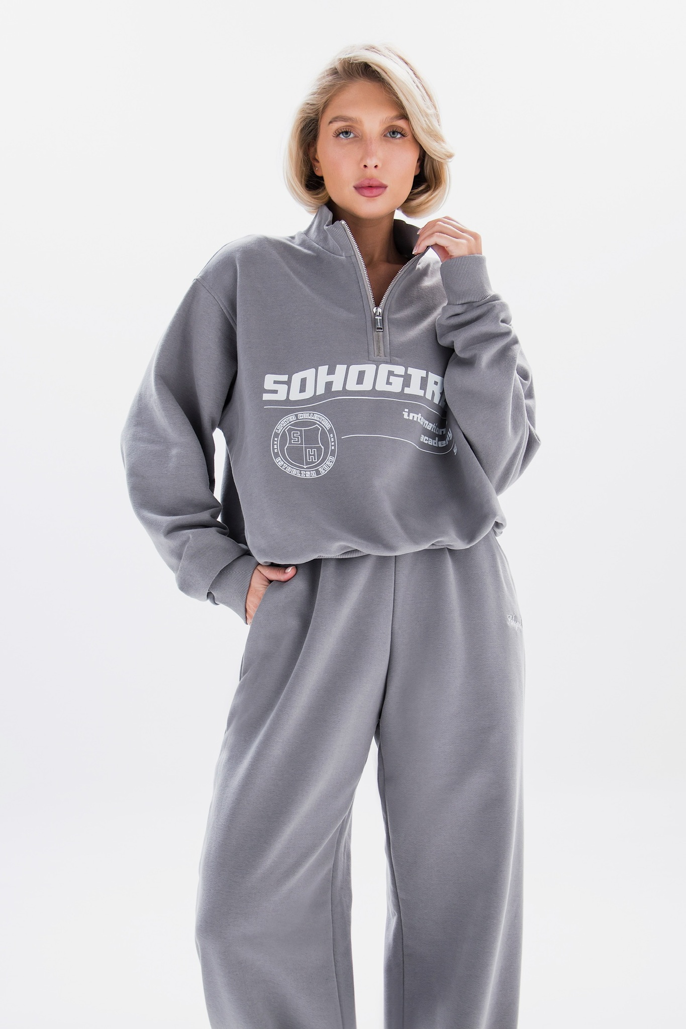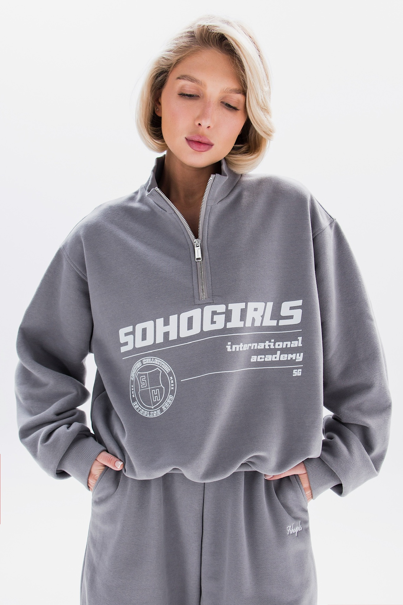 Свитшот свободного кроя выполнен из мягкой приятной ткани с принтом на груди и молнией.