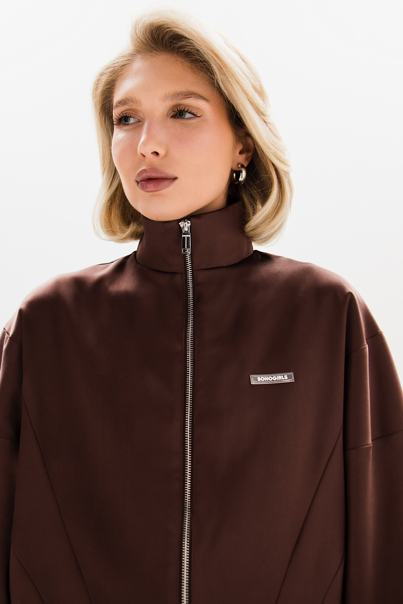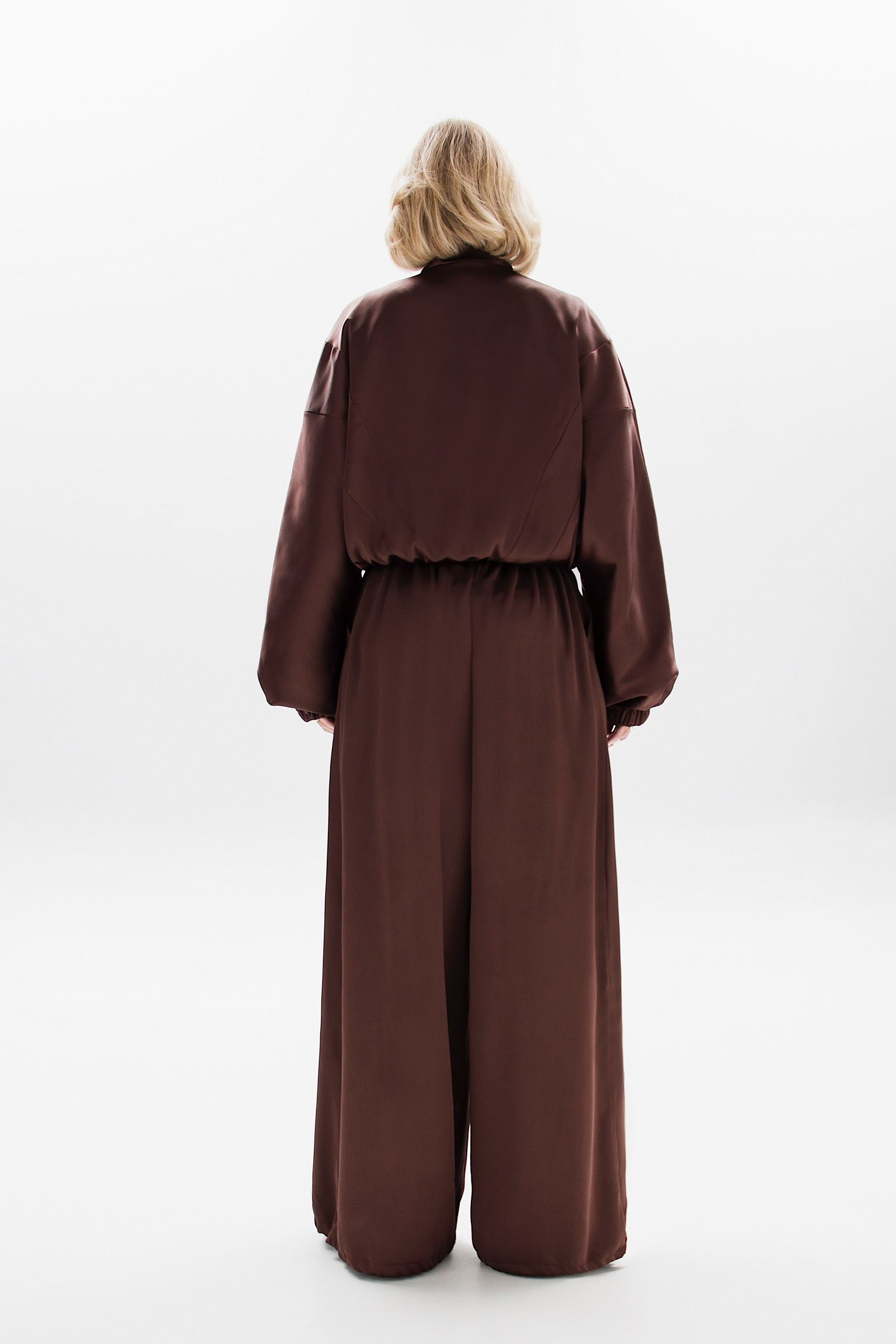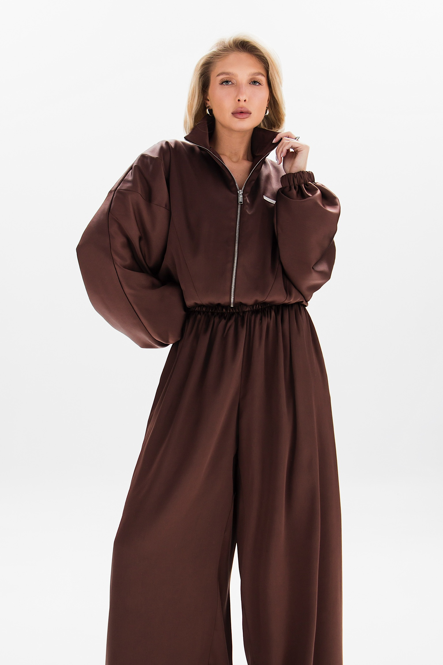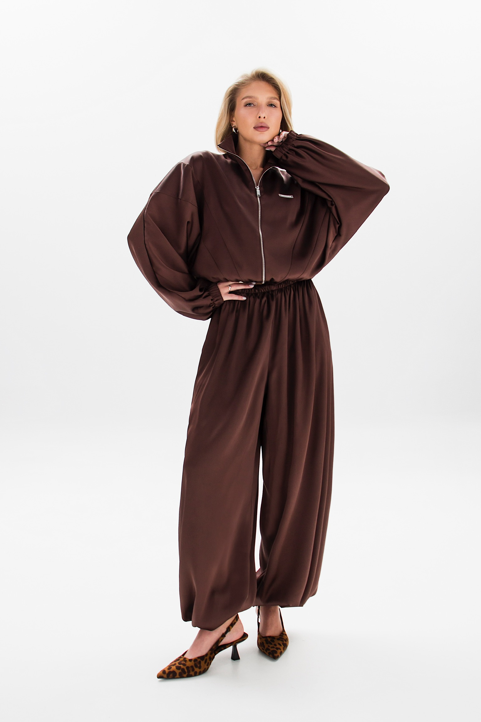 Толстовка из гладкого атласа с мягким матовым блеском — сочетание торжественности и сдержанной элегантности. Лёгкое сияние материала делает образ более выразительным, оставаясь при этом минималистичным и универсальным.