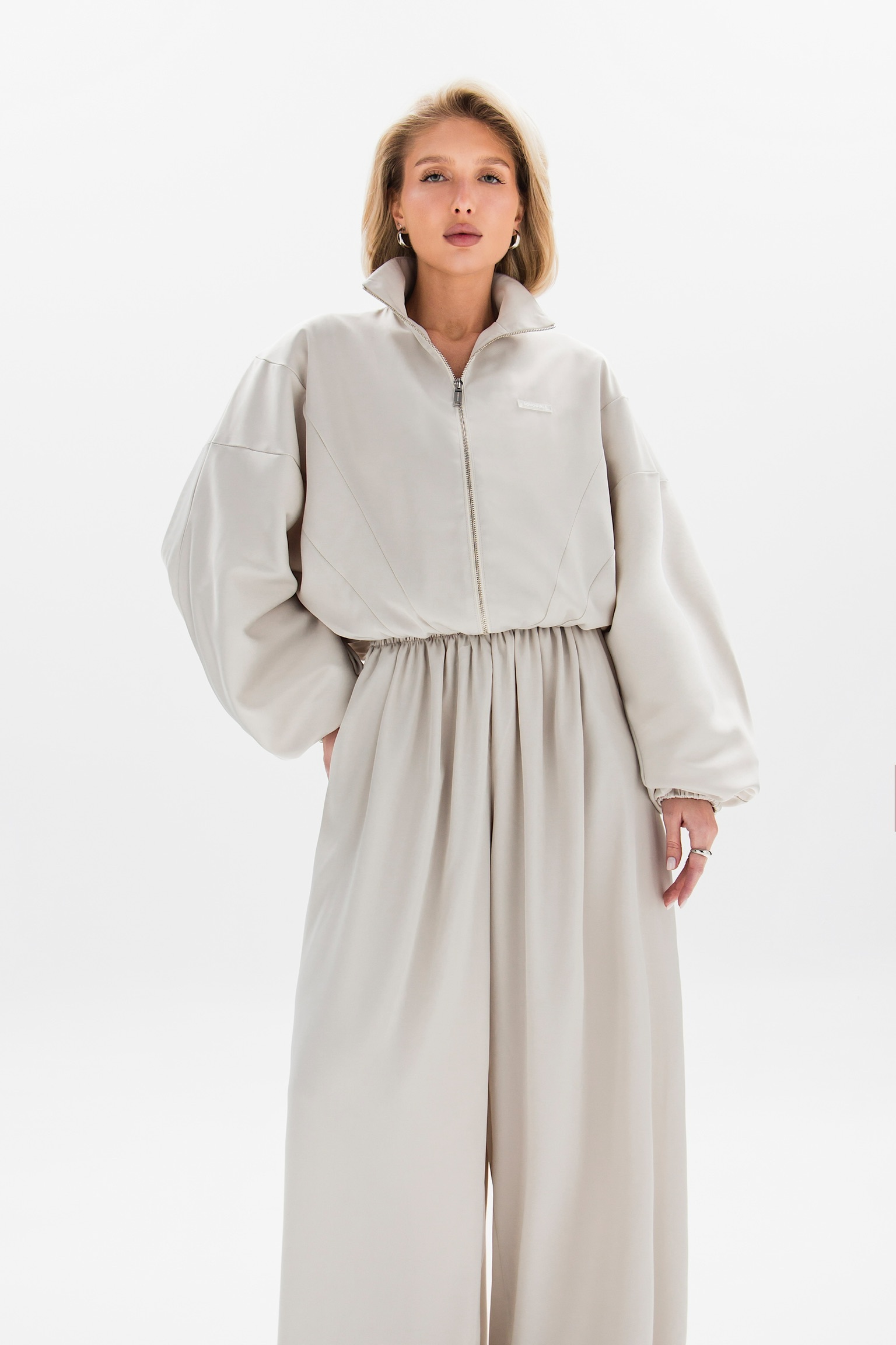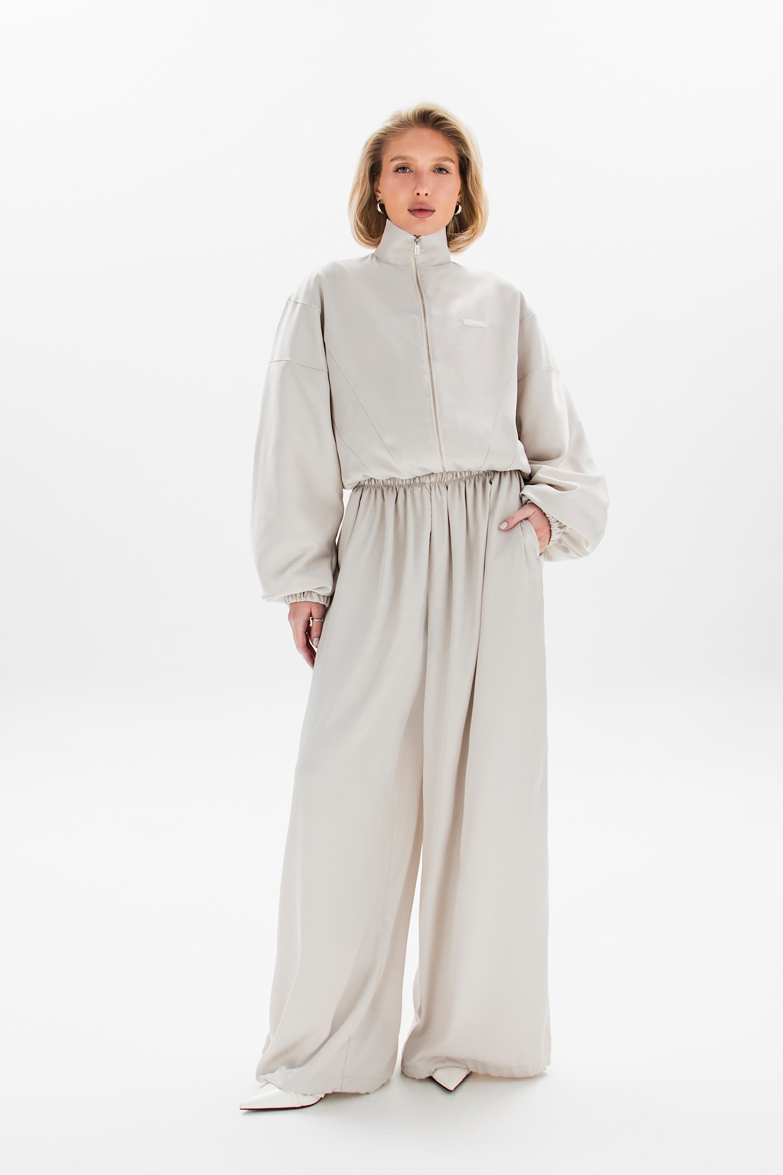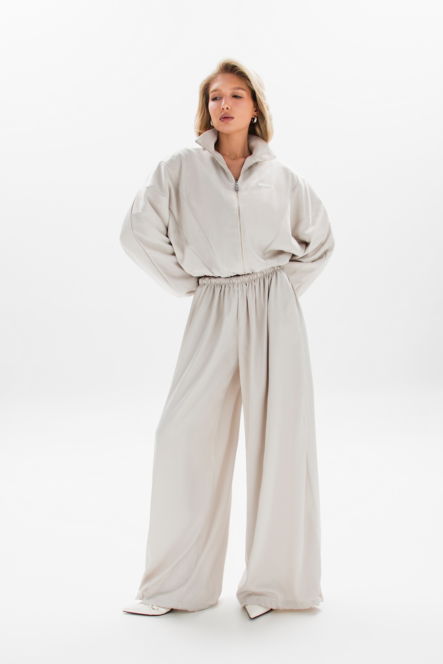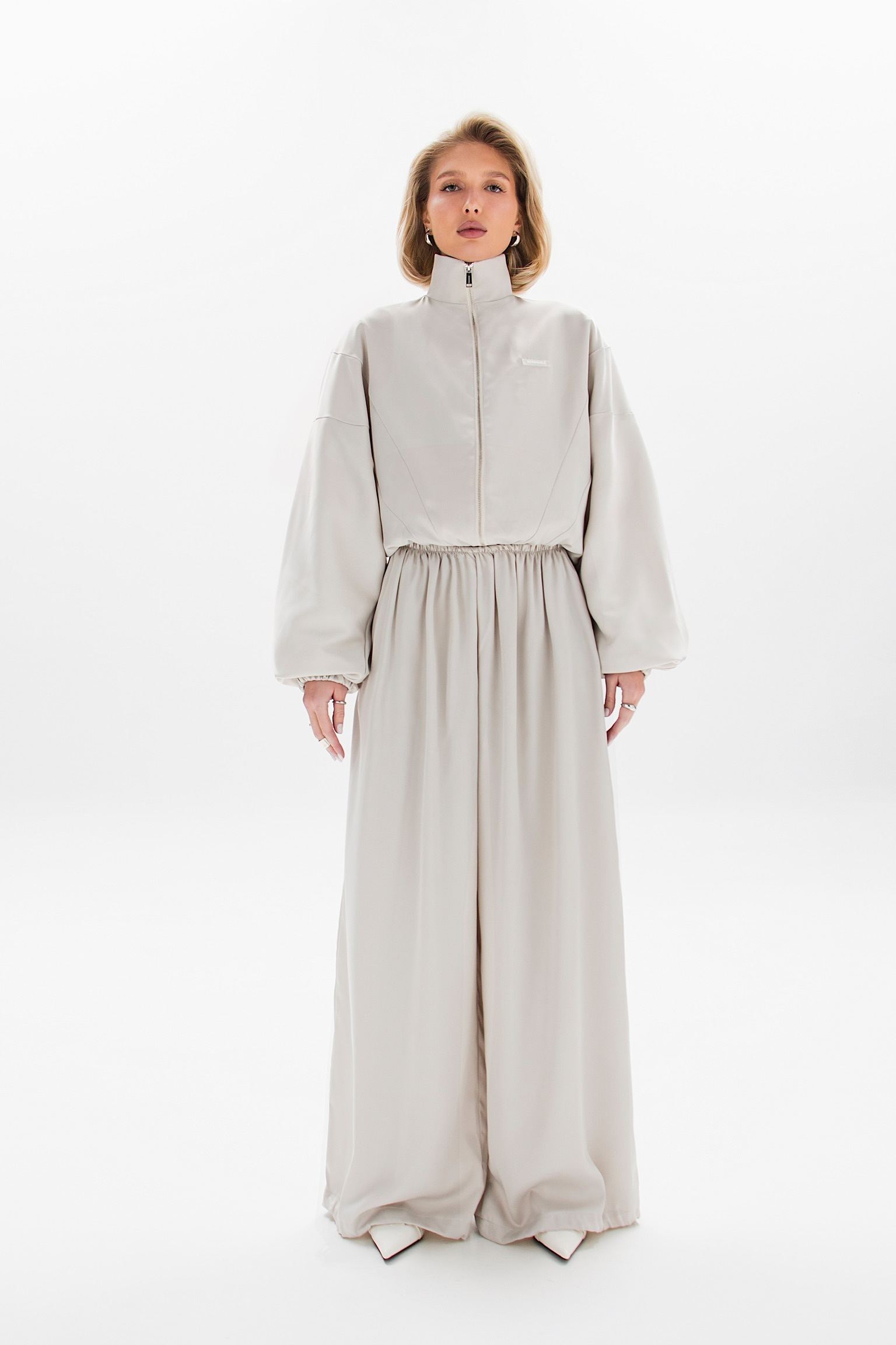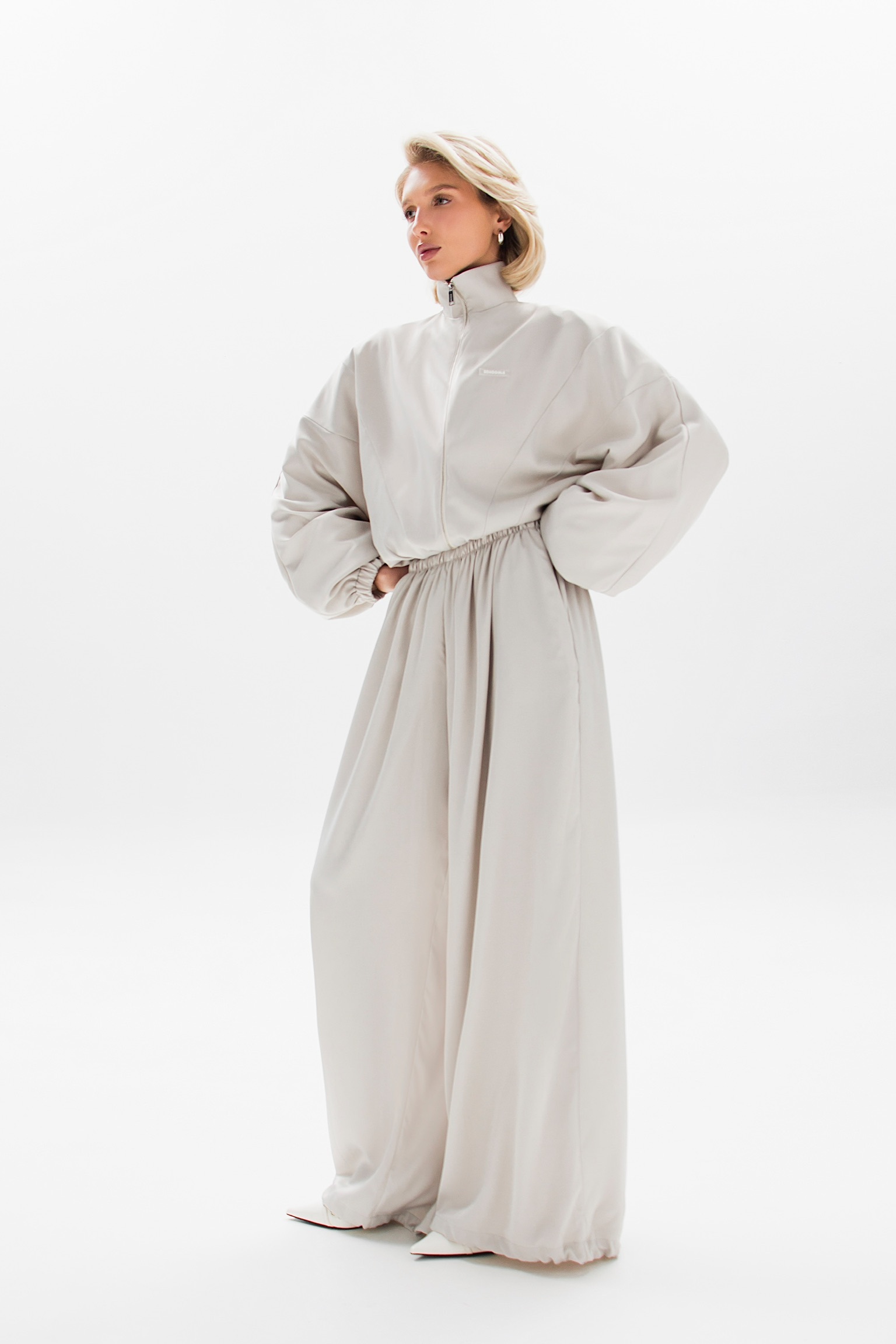 Толстовка из гладкого атласа с мягким матовым блеском — сочетание торжественности и сдержанной элегантности. Лёгкое сияние материала делает образ более выразительным, оставаясь при этом минималистичным и универсальным.